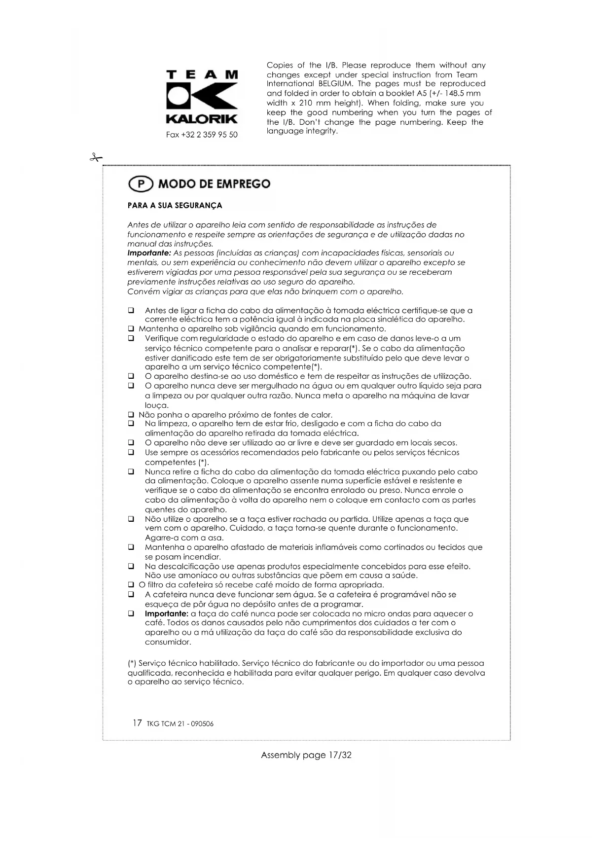 Antes de qualquer limpeza, coloque o interruptor na posição off/desliada, retire a ficha do cabo da alimentação da tomada eléctrica e deixe arrefecer a máquina de café. O filtro de papel, o filtro de plástico, a taça de vidro, a tampa da taça de vidro podem ser limpas com uma solução de água quente ou em sabonária. O corpo da máquina de café pode ser limpo com um pano macio e húmido. Nunca mergulhe o corpo da máquina de café em água ou em outros líquidos. Nunca utilize na limpeza produtos abrasivos ou solventes. Ao descalcificar a máquina de café prolonga-lhe a vida útil da mesma. Na descalcificação utilize descalcificantes apropriados para as máquinas de café. Nunca ponha a taça de vidro na máquina de lavar a loiça. Copies of the I/B. Please reproduce them without any changes except under special instruction from Team International BELGIUM. The pages must be reproduced and folded in order to obtain a booklet A5 (+/- 148.5 mm width x 210 mm height). When folding, make sure you keep the good numbering when you turn the pages of the I/B. Don’t change the page numbering. Keep the language integrity.