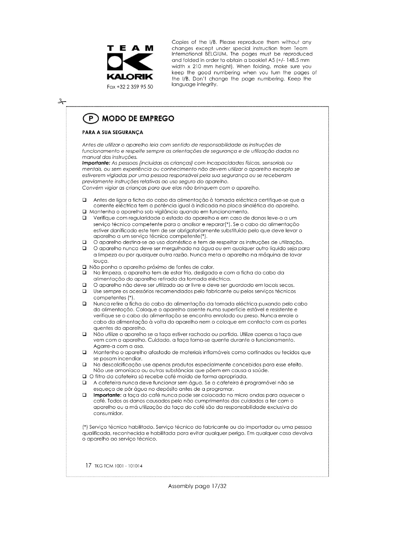 Quando verificar que o tempo para a obtenção do café está a aumentar tem de fazer uma descalcificação do aparelho para evitar danos maiores. A descalcificação é feita sempre que o aparelho dê sinais de que a preparação do café se prolonga no tempo, ou seja demora mais tempo a sair. Deve ter sempre em atenção o problema da calcificação e usar produtos próprios para a descalcificação. A limpeza e o cuidado do aparelho permite aumentar a sua durabilidade e lembramos que a substituição das resistências calcificadas não está abrangida pela garantia. PROTECÇÃO DO MEIO AMBIENTE – DIRECTIVA 2002/96/CE Para a preservação do ambiente e da nossa saúde, a eliminação no fim da vida útil dos aparelhos eléctricos e electrónicos, deve-se efectuar no cumprimento das legislações em vigor e pela participação de todos quer sejam produtores ou utilizadores. É por esta razão que o vosso aparelho tem na placa sinalética o símbolo , informando que em caso algum o aparelho deve ser colocado no caixote do lixo camarário ou privado para que não vá para as lixeiras comuns mas sim devolvido ao revendedor ou depositado nos locais apropriados e identificados para a recolha destes aparelhos para que uma vez recolhidos sejam reciclados, reutilizados ou lhe sejam dados outras aplicações. Copies of the I/B. Please reproduce them without any changes except under special instruction from Team International BELGIUM. The pages must be reproduced and folded in order to obtain a booklet A5 (+/- 148.5 mm width x 210 mm height). When folding, make sure you keep the good numbering when you turn the pages of the I/B. Don’t change the page numbering. Keep the language integrity.