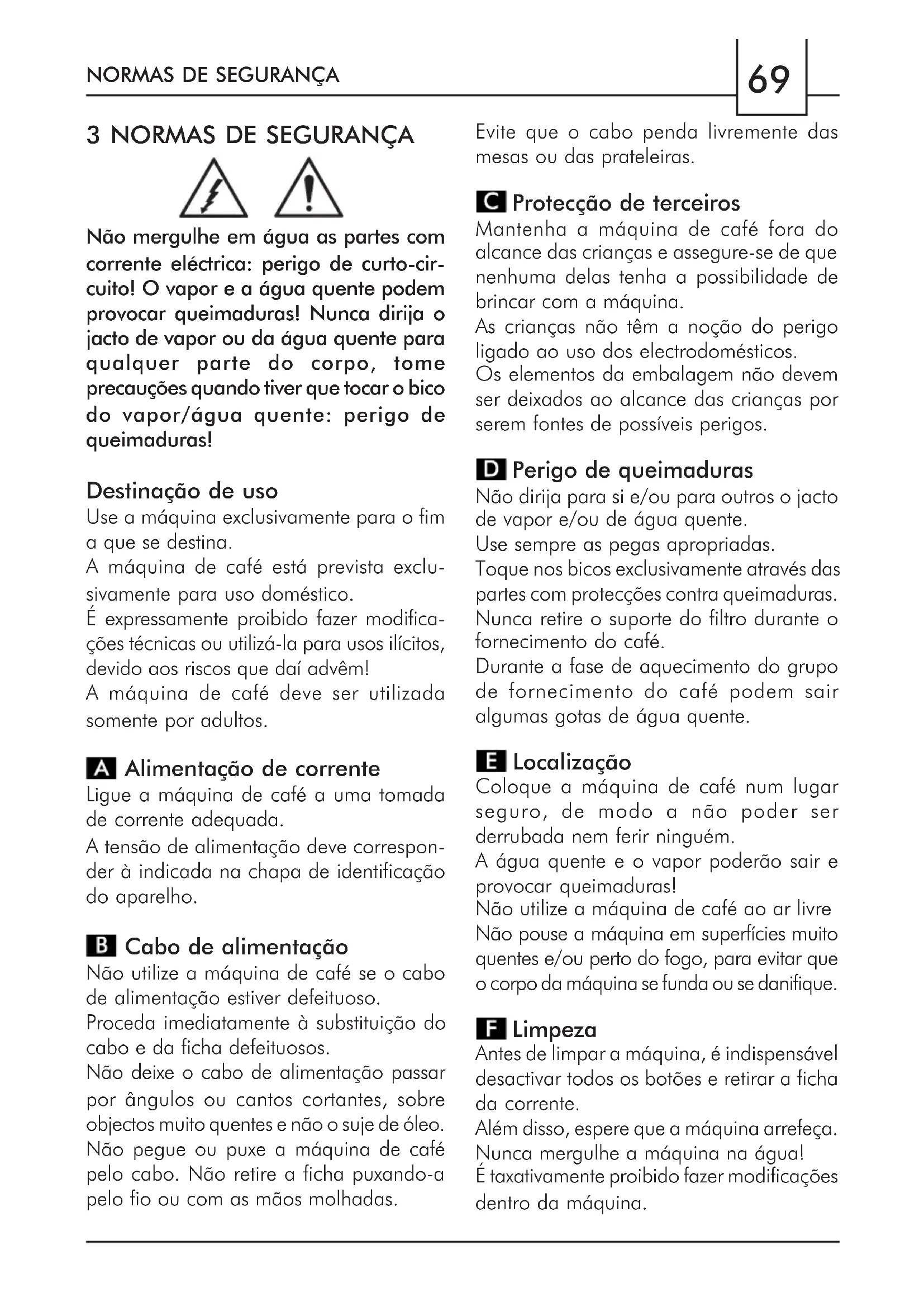 Não mergulhe em água as partes com corrente eléctrica: perigo de curto-cir- cuito! O vapor e a água quente podem provocar queimaduras! Nunca dirija o jacto de vapor ou da água quente para qualquer parte do corpo, tome precauções quando tiver que tocar o bico do vapor/água quente: perigo de queimaduras! Destinação de uso Use a máquina exclusivamente para o fim a que se destina. A máquina de café está prevista exclu- sivamente para uso doméstico. É expressamente proibido fazer modifica- ções técnicas ou utilizá-la para usos ilícitos, devido aos riscos que daí advêm! A máquina de café deve ser utilizada somente por adultos. Alimentação de corrente Ligue a máquina de café a uma tomada de corrente adequada. A tensão de alimentação deve correspon- der à indicada na chapa de identificação do aparelho. Cabo de alimentação Não utilize a máquina de café se o cabo de alimentação estiver defeituoso. Proceda imediatamente à substituição do cabo e da ficha defeituosos. Não deixe o cabo de alimentação passar por ângulos ou cantos cortantes, sobre objectos muito quentes e não o suje de óleo. Não pegue ou puxe a máquina de café pelo cabo. Não retire a ficha puxando-a pelo fio ou com as mãos molhadas. Evite que o cabo penda livremente das mesas ou das prateleiras. Protecção de terceiros Mantenha a máquina de café fora do alcance das crianças e assegure-se de que nenhuma delas tenha a possibilidade de brincar com a máquina. As crianças não têm a noção do perigo ligado ao uso dos electrodomésticos. Os elementos da embalagem não devem ser deixados ao alcance das crianças por serem fontes de possíveis perigos. Perigo de queimaduras Não dirija para si e/ou para outros o jacto de vapor e/ou de água quente. Use sempre as pegas apropriadas. Toque nos bicos exclusivamente através das partes com protecções contra queimaduras. Nunca retire o suporte do filtro durante o fornecimento do café. Durante a fase de aquecimento do grupo de fornecimento do café podem sair algumas gotas de água quente. Localização Coloque a máquina de café num lugar seguro, de modo a não poder ser derrubada nem ferir ninguém. A água quente e o vapor poderão sair e provocar queimaduras! Não utilize a máquina de café ao ar livre Não pouse a máquina em superfícies muito quentes e/ou perto do fogo, para evitar que o corpo da máquina se funda ou se danifique. Limpeza Antes de limpar a máquina, é indispensável desactivar todos os botões e retirar a ficha da corrente. Além disso, espere que a máquina arrefeça. Nunca mergulhe a máquina na água! É taxativamente proibido fazer modificações dentro da máquina.70