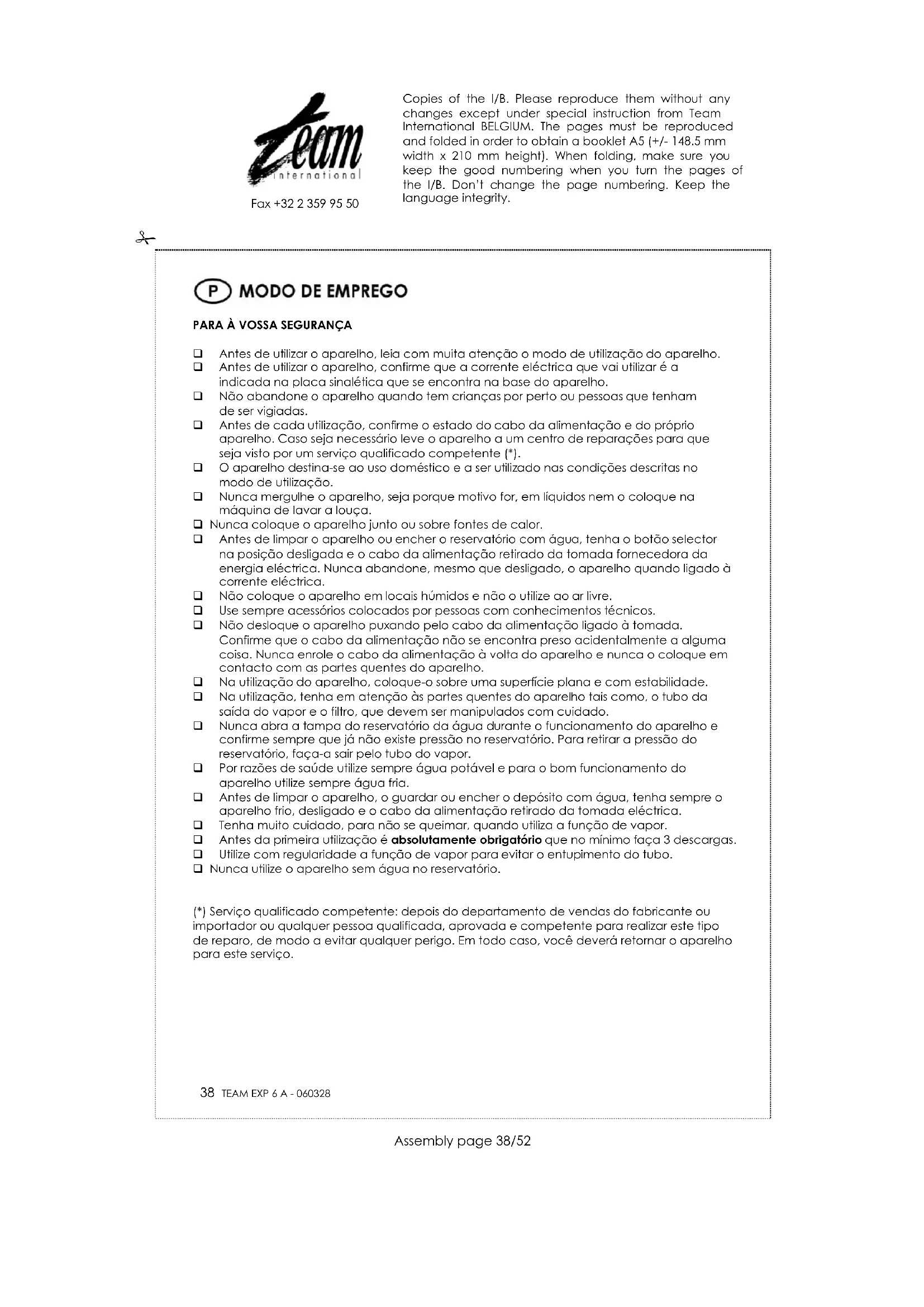 Fax +32 2 359 95 50 PROTECÇÃO DO MEIO AMBIENTE – DIRECTIVA 2002/96/CE Para a preservação do ambiente e da nossa saúde, a eliminação no fim da vida útil dos aparelhos eléctricos e electrónicos, deve-se efectuar no cumprimento das legislações em vigor e pela participação de todos quer sejam produtores ou utilizadores. É por esta razão que o vosso aparelho tem na placa sinalética o simbolo , informando que em caso algum o aparelho deve ser colocado no caixote do lixo camarário ou privado para que não vá para as lixeiras comuns mas sim devolvido ao revendedor ou depositado nos locais apropriados e identificados para a recolha destes aparelhos para que uma vez recolhidos sejam reciclados, reutilizados ou lhe sejam dados outras aplicações. Copies of the I/B. Please reproduce them without any changes except under special instruction from Team International BELGIUM. The pages must be reproduced and folded in order to obtain a booklet A5 (+/- 148.5 mm width x 210 mm height). When folding, make sure you keep the good numbering when you turn the pages of the I/B. Don’t change the page numbering. Keep the language integrity.