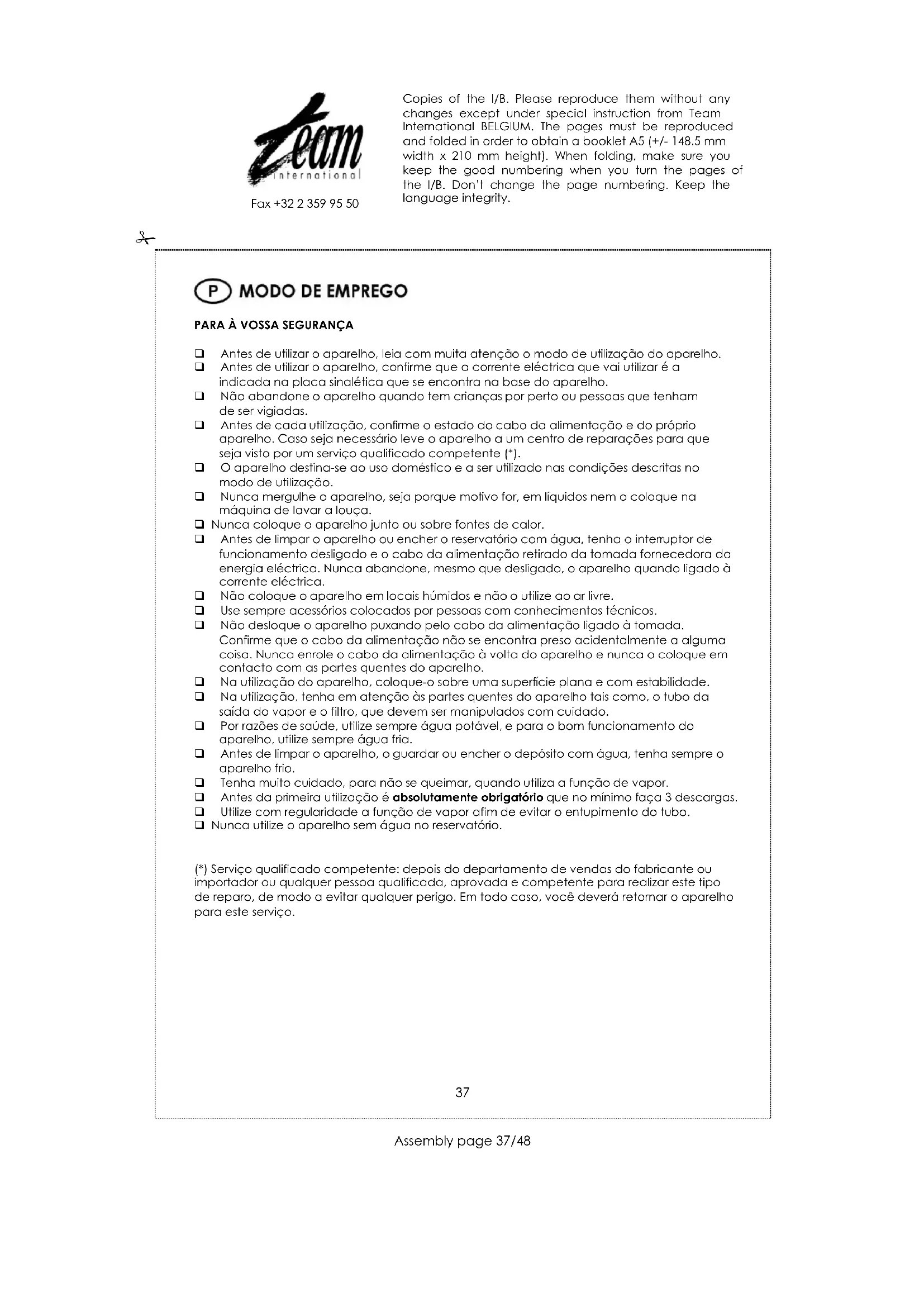 Nautilização, tenha em atençao as partes quentes do aparelho tais como, o tubo da saía do vapor e o Fifro, que devem ser Manipulados com cuidado.