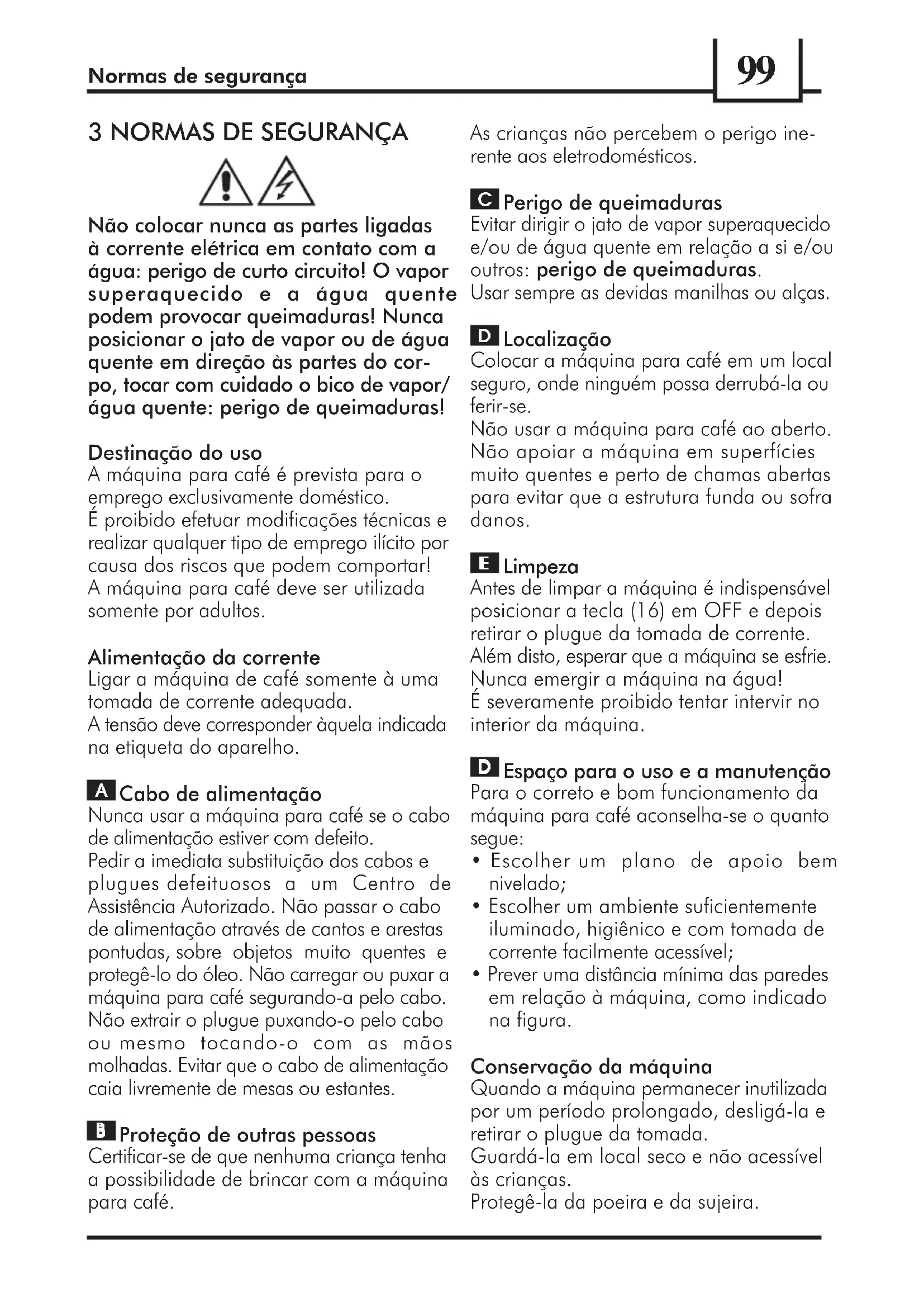 Não colocar nunca as partes ligadas à corrente elétrica em contato com a água: perigo de curto circuito! O vapor superaquecido e a água quente podem provocar queimaduras! Nunca posicionar o jato de vapor ou de água quente em direção às partes do cor- po, tocar com cuidado o bico de vapor/ água quente: perigo de queimaduras! Destinação do uso A máquina para café é prevista para o emprego exclusivamente doméstico. É proibido efetuar modificações técnicas e realizar qualquer tipo de emprego ilícito por causa dos riscos que podem comportar! A máquina para café deve ser utilizada somente por adultos. Alimentação da corrente Ligar a máquina de café somente à uma tomada de corrente adequada. A tensão deve corresponder àquela indicada na etiqueta do aparelho. Cabo de alimentação Nunca usar a máquina para café se o cabo de alimentação estiver com defeito. Pedir a imediata substituição dos cabos e plugues defeituosos a um Centro de Assistência Autorizado. Não passar o cabo de alimentação através de cantos e arestas pontudas, sobre objetos muito quentes e protegê-lo do óleo. Não carregar ou puxar a máquina para café segurando-a pelo cabo. Não extrair o plugue puxando-o pelo cabo ou mesmo tocando-o com as mãos molhadas. Evitar que o cabo de alimentação caia livremente de mesas ou estantes. Proteção de outras pessoas Certificar-se de que nenhuma criança tenha a possibilidade de brincar com a máquina para café. As crianças não percebem o perigo ine- rente aos eletrodomésticos. Perigo de queimaduras Evitar dirigir o jato de vapor superaquecido e/ou de água quente em relação a si e/ou outros: perigo de queimaduras. Usar sempre as devidas manilhas ou alças. Localização Colocar a máquina para café em um local seguro, onde ninguém possa derrubá-la ou ferir-se. Não usar a máquina para café ao aberto. Não apoiar a máquina em superfícies muito quentes e perto de chamas abertas para evitar que a estrutura funda ou sofra danos. Limpeza Antes de limpar a máquina é indispensável posicionar a tecla (16) em OFF e depois retirar o plugue da tomada de corrente. Além disto, esperar que a máquina se esfrie. Nunca emergir a máquina na água! É severamente proibido tentar intervir no interior da máquina. Espaço para o uso e a manutenção Para o correto e bom funcionamento da máquina para café aconselha-se o quanto segue: Escolher um plano de apoio bem nivelado; Escolher um ambiente suficientemente iluminado, higiênico e com tomada de corrente facilmente acessível; Prever uma distância mínima das paredes em relação à máquina, como indicado na figura. Conservação da máquina Quando a máquina permanecer inutilizada por um período prolongado, desligá-la e retirar o plugue da tomada. Guardá-la em local seco e não acessível às crianças. Protegê-la da poeira e da sujeira.100 Normas de segurança - Descrição do painel de comando Reparação / Manutenção No caso de problemas, defeitos ou suspeita de defeito após uma queda desligar imediatamente o plugue da tomada. Nunca funcionar uma máquina com defeito. Somente os Centros de Assistência Autorizados podem efetuar intervenções e reparações. No caso de intervenções não efetuados por Centros de Assistência Autorizados, decli- na-se qualquer responsabilidade por eventuais danos. Anti-incêndio Em caso de incêndio utilizar extintores de gás carbônico (CO