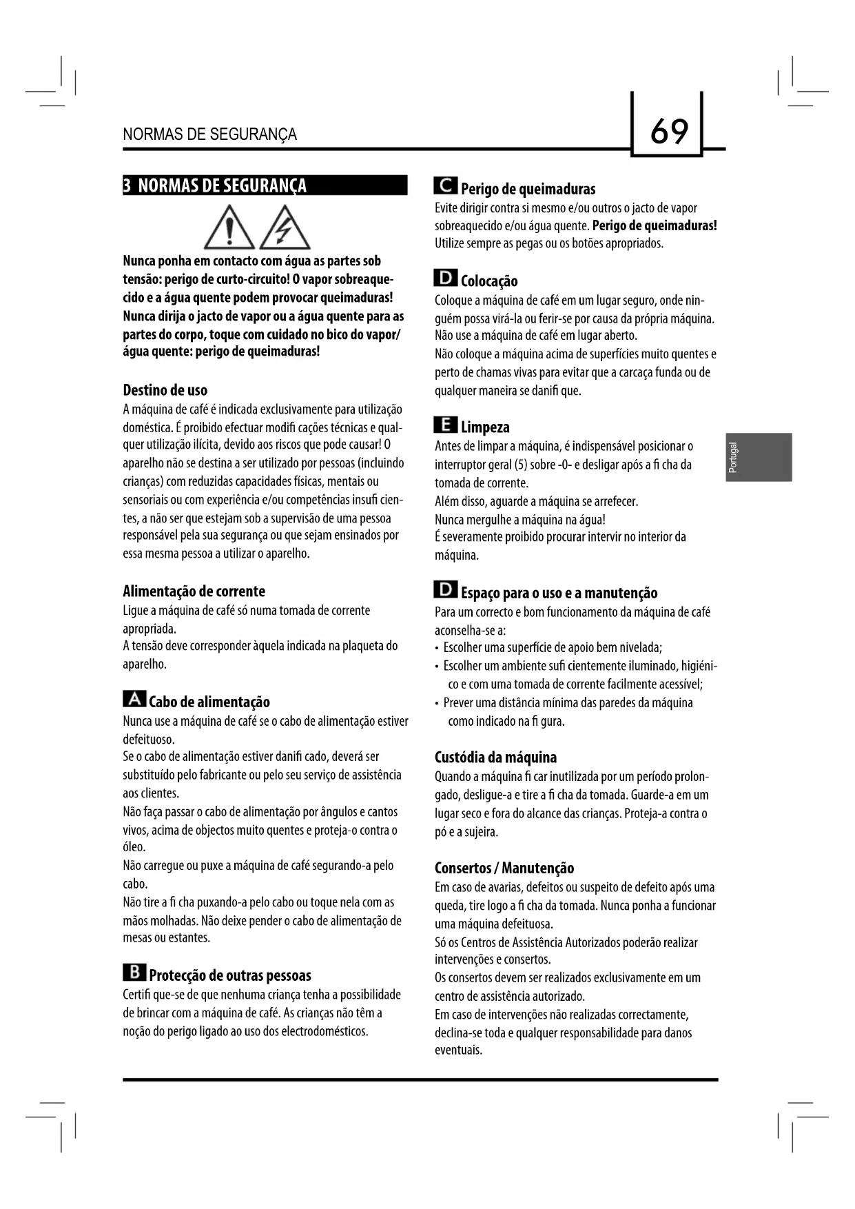 Perigo de queimaduras Evite dirigir contra si mesmo e/ou outros o jacto de vapor sobreaquecido e/ou água quente. Perigo de queimaduras! Utilize sempre as pegas ou os botões apropriados. Colocação Coloque a máquina de café em um lugar seguro, onde nin- guém possa virá-la ou ferir-se por causa da própria máquina. Não use a máquina de café em lugar aberto. Não coloque a máquina acima de superfícies muito quentes e perto de chamas vivas para evitar que a carcaça funda ou de qualquer maneira se dani que. Limpeza Antes de limpar a máquina, é indispensável posicionar o interruptor geral (5) sobre -0- e desligar após a cha da tomada de corrente. Além disso, aguarde a máquina se arrefecer. Nunca mergulhe a máquina na água! É severamente proibido procurar intervir no interior da máquina. Espaço para o uso e a manutenção Para um correcto e bom funcionamento da máquina de café aconselha-se a: