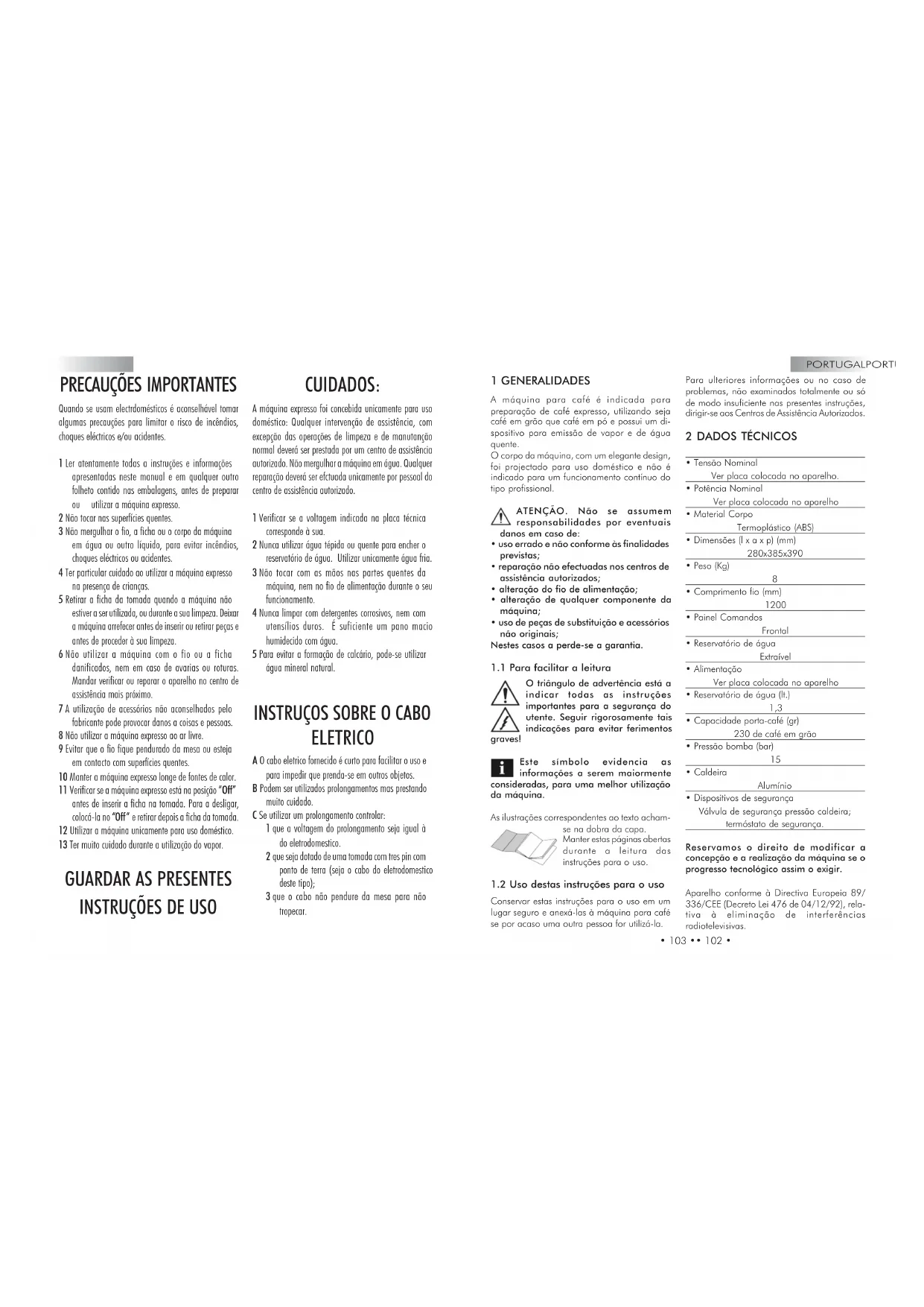 - Dispositivos de segurança Válvula de segurança pressão caldeira; termóstato de segurança. Reservamos o direito de modificar a concepção e a realização da máquina se o progresso tecnológico assim o exigir. Aparelho conforme à Directiva Europeia 89/ 336/CEE (Decreto Lei 476 de 04/12/92), rela- tiva à eliminação de interferências radiotelevisivas.PORTUGALPORTUGAL