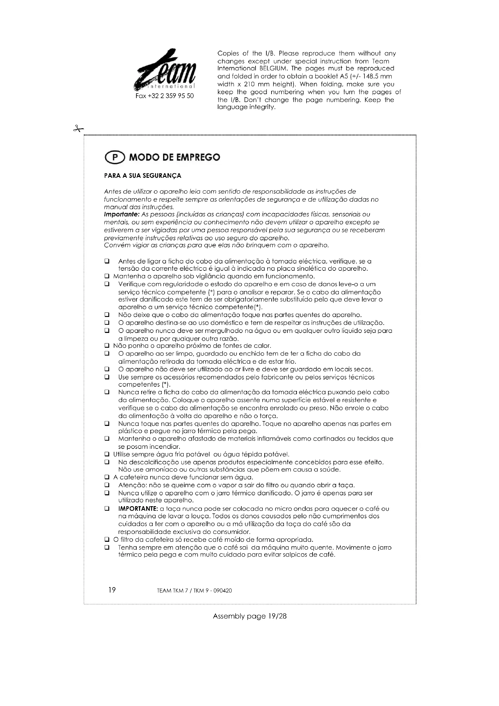 Fax +32 2 359 95 50 da água. Deve ter sempre em atenção o problema da calcificação e usar produtos próprios para a descalcificação. Para uma maior duração do aparelho descalcifique-o. Na descalcificação do aparelho utilize só produtos para esse fim e leia as instruções dos mesmos. Sem café no filtro, faça circular pelo interior do aparelho dois depósitos de água fria potável. A garantia não cobre danos causados pela não desclacificação do aparelho. Nunca ponha o aparelho ou os acessórios na máquina de lavar a louça. Lave o jarro em sabonária de água morna. Para limpar as partes de plástico do aparelho utilize panos ou esfregões macios e não abrasivo. PROTECÇÃO DO MEIO AMBIENTE – DIRECTIVA 2002/96/CE Para a preservação do ambiente e da nossa saúde, a eliminação no fim da vida útil dos aparelhos eléctricos e electrónicos, deve-se efectuar no cumprimento das legislações em vigor e pela participação de todos quer sejam produtores ou utilizadores. É por esta razão que o vosso aparelho tem na placa sinalética o símbolo , informando que em caso algum o aparelho deve ser colocado no caixote do lixo camarário ou privado para que não vá para as lixeiras comuns mas sim devolvido ao revendedor ou depositado nos locais apropriados e identificados para a recolha destes aparelhos para que uma vez recolhidos sejam reciclados, reutilizados ou lhe sejam dados outras aplicações. Copies of the I/B. Please reproduce them without any changes except under special instruction from Team International BELGIUM. The pages must be reproduced and folded in order to obtain a booklet A5 (+/- 148.5 mm width x 210 mm height). When folding, make sure you keep the good numbering when you turn the pages of the I/B. Don’t change the page numbering. Keep the language integrity.