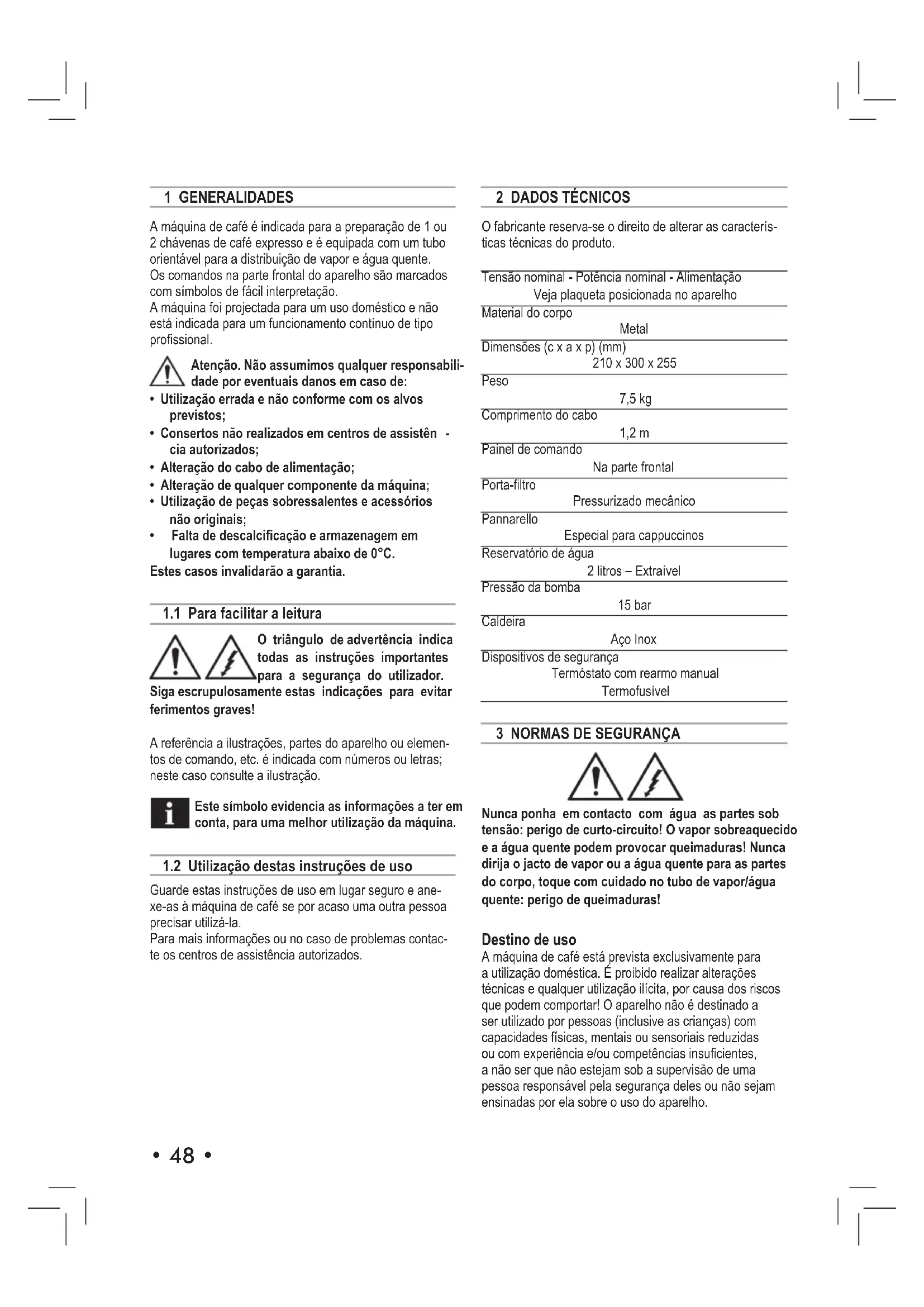 O fabricante reserva-se o direito de alterar as caracterís- ticas técnicas do produto. Tensão nominal - Potência nominal - Alimentação Veja plaqueta posicionada no aparelho Material do corpo Metal Dimensões (c x a x p) (mm) 210 x 300 x 255 Peso 7,5 kg Comprimento do cabo 1,2 m Painel de comando Na parte frontal Porta-ltro Pressurizado mecânico Pannarello Especial para cappuccinos Reservatório de água 2 litros – Extraível Pressão da bomba 15 bar Caldeira Aço Inox Dispositivos de segurança Termóstato com rearmo manual Termofusível