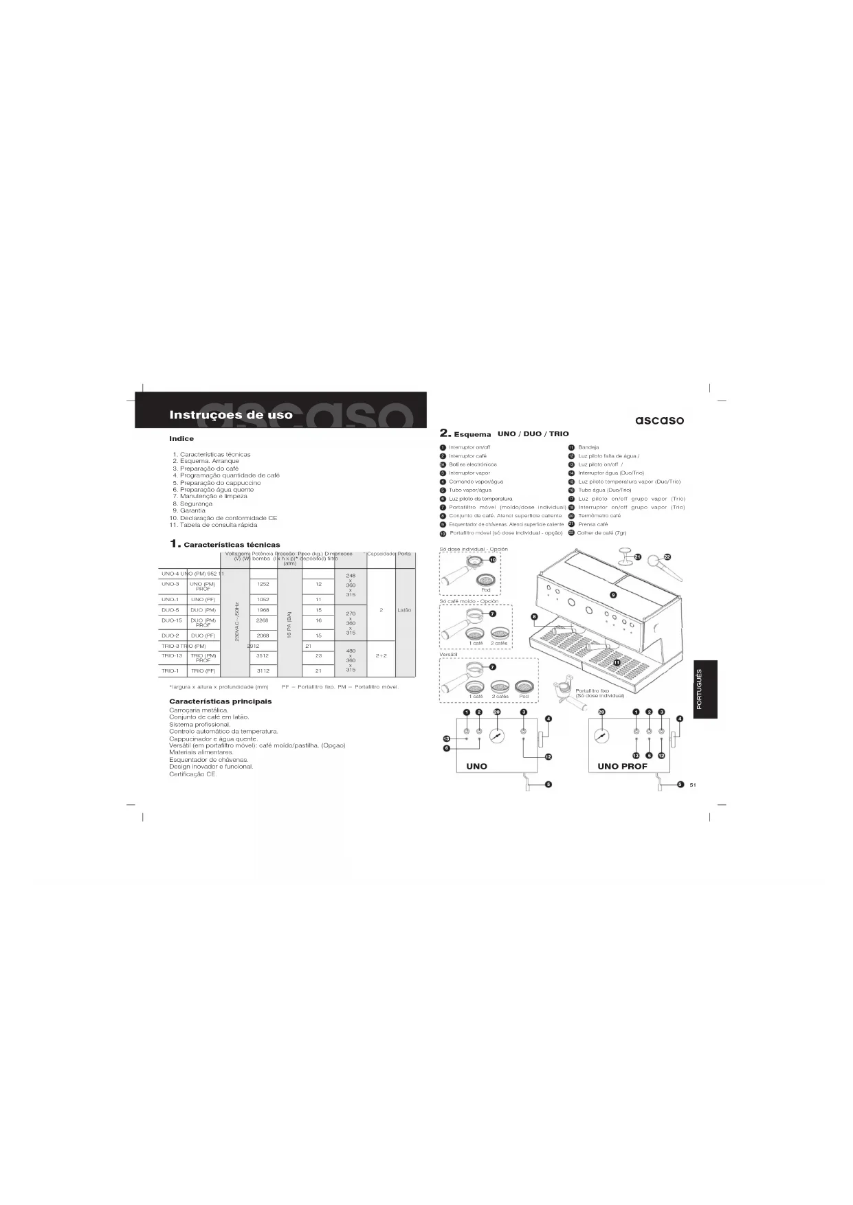 Indice 1. Características técnicas2. Esquema. Arranque3. Preparação do café 4. Programação quantidade de café5. Preparação do cappuccino6. Preparação água quente7. Manutenção e limpeza8. Segurança9. Garantia10. Declaração de conformidade CE11. Tabela de consulta rápida