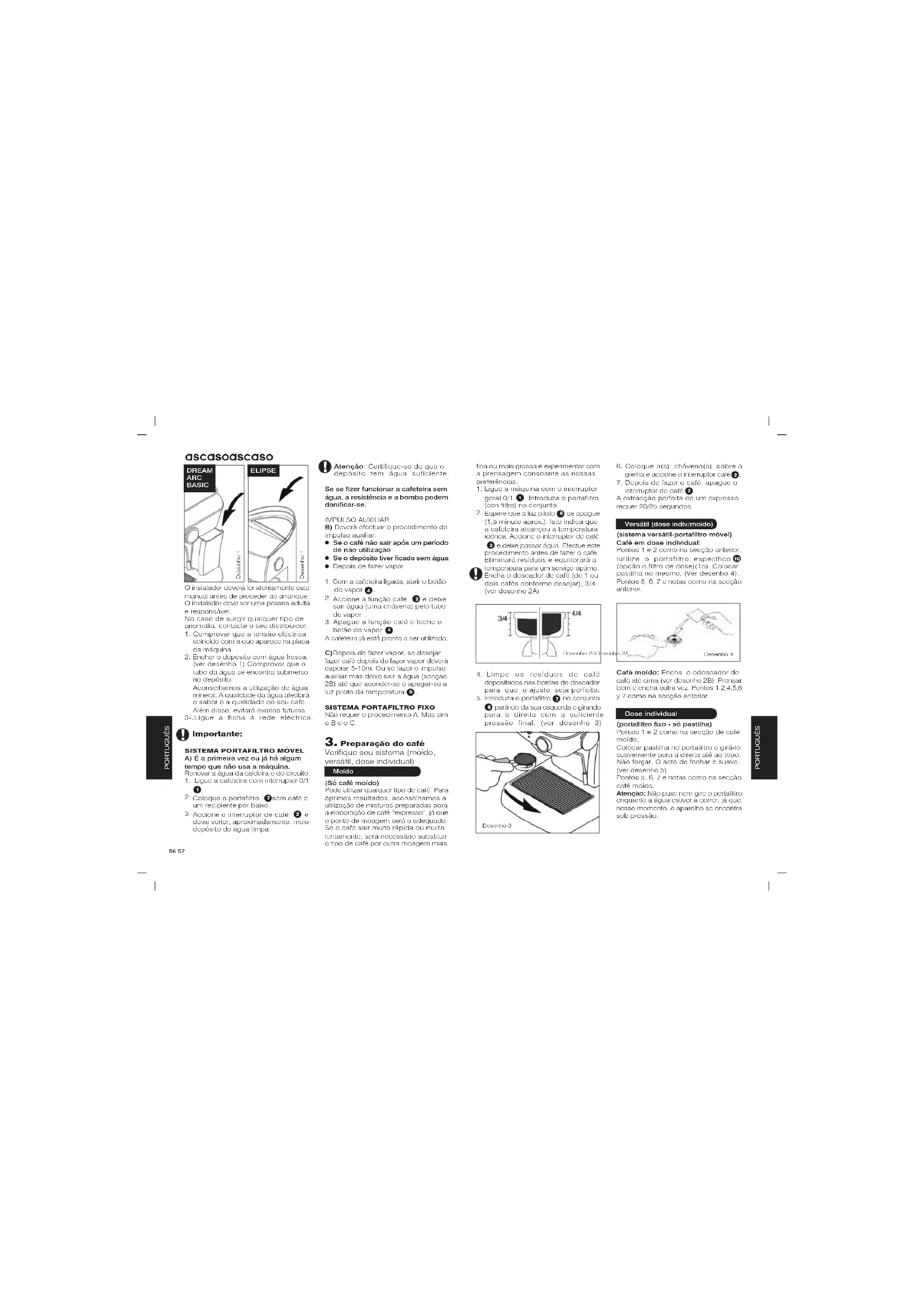 Desenho 5Desenho 6DREAM ARC BASICELIPSEDesenho 62-. Limpeza interna: a limpeza e o cuidado preventivo do sistema interno da sua máquina são vitais para obter um expresso de óptima qualidade. Para a limpeza interior do conjunto de distribuição, utilize o produto Ascaso Coffee Washer. Este produto também é útil para a descalcificação da máquina. Uma descalcificação regular da sua cafeteira contribuirá para assegurar uma excelente qualidade do café e para prolongar a vida útil do aparelho. Consulte o seu distribuidor. Recomendações de uso do Coffee Washer: Para prevenir problemas de calcário, também pode utilizar filtros de tratamento da água. No entanto, recomenda-se a realização da operação de limpeza adequada ao seu consumo. O uso dos filtros e o Coffee Washer ajudá-lo-ão a prolongar a vida da cafeteira num estado óptimo. É aconselhável não deixar café moído ou monodoses no porta-filtro. O café deixará resíduos que afectarão a limpeza da cafeteira e o sabor do café. Se isso acontecer, deixe passar uma carga de água. 3-.Limpeza de porta-filtros e vaporizadores