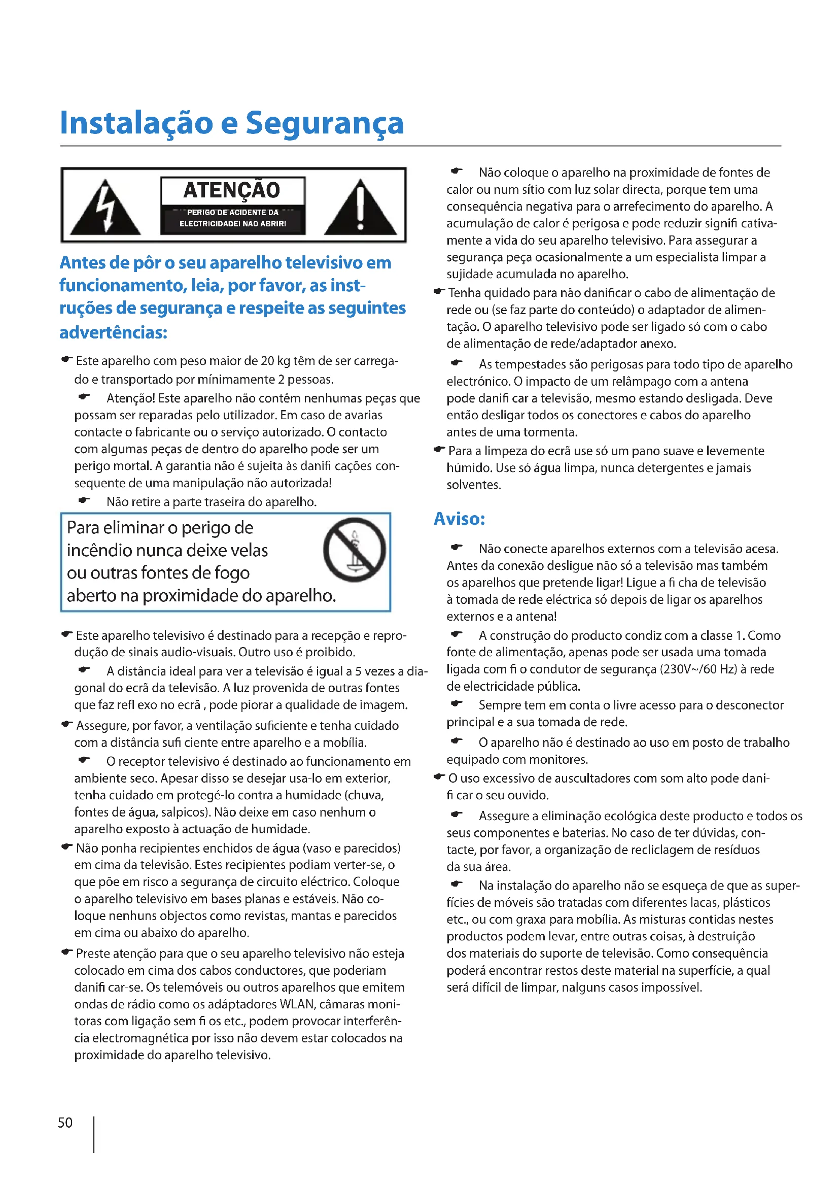 Instalação e Segurança O ecrã do seu televisor LCD corresponde aos altos reque- rimentos de qualidade e foi posto à prova várias vezes para detectar píxeis defectuosos. Devido a tecnologia do processo de produção (mesmo com a maior atenção na produção de ecrã) não se pode a 100% excluir a aparição de píxeis defeituosos no ecrã. Estes píxeis defeituosos não são considerados como um defeito dentro de garantia do aparelho se a sua extensão não ultrapasse límites de nidas seguindo a norma DIN. Informação Importante Relativa à Uti- lização de Videojogos, Computadores, Legendas ou Outras Visualizações de Imagem Fixa A utilização prolongada de material de programa de imagem xa pode causar uma „imagem sombra“ permanen- te no painel LCD. Esta imagem de fundo é visível em programas normais sob a forma de uma imagem estacionária xa. Este tipo de dete- rioração irreversível do painel LCD/LED pode ser limitada ao efectuar os seguintes passos: