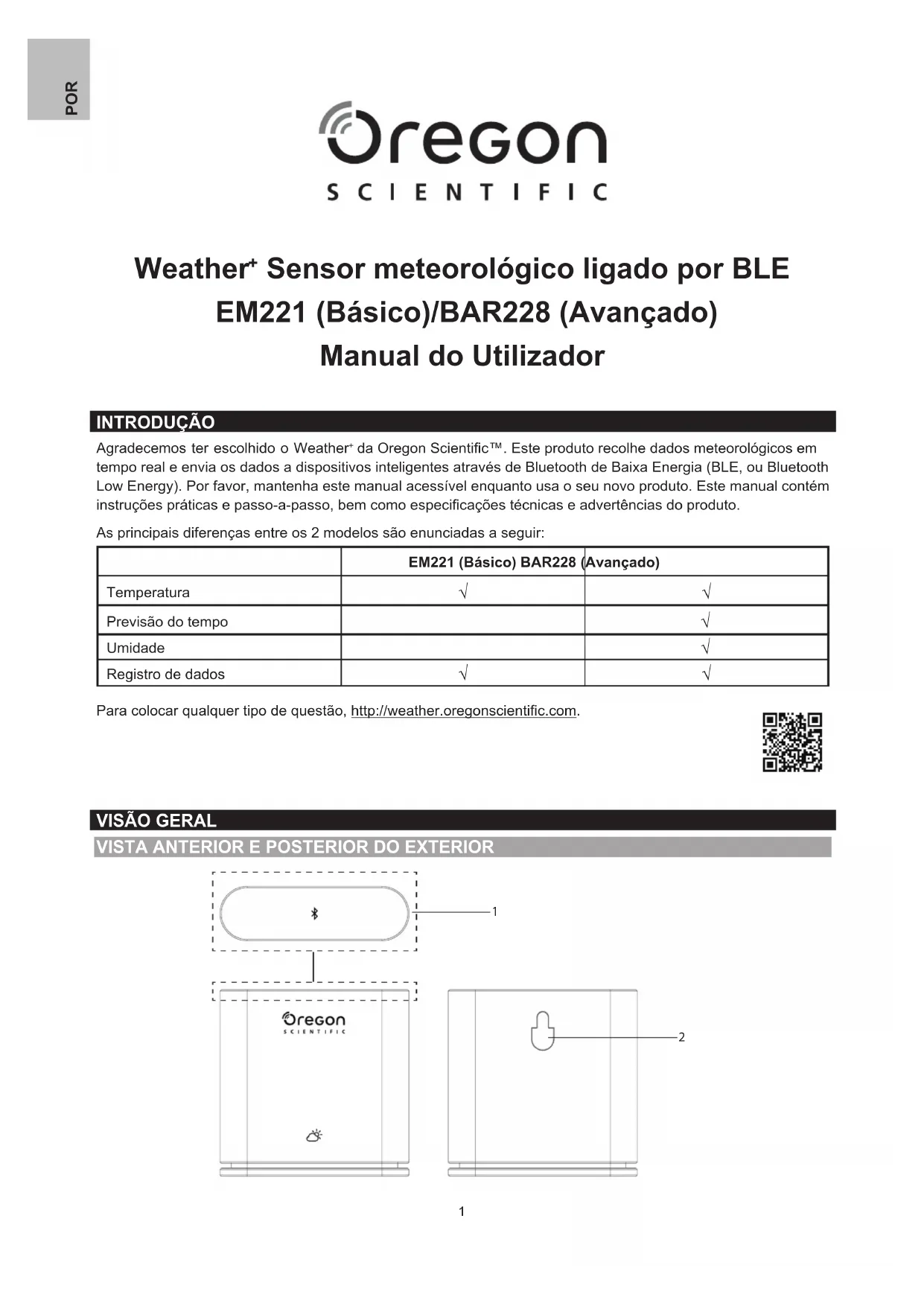 da Oregon Scientic™. Este produto recolhe dados meteorológicos em tempo real e envia os dados a dispositivos inteligentes através de Bluetooth de Baixa Energia (BLE, ou Bluetooth Low Energy). Por favor, mantenha este manual acessível enquanto usa o seu novo produto. Este manual contém instruções práticas e passo-a-passo, bem como especicações técnicas e advertências do produto. As principais diferenças entre os 2 modelos são enunciadas a seguir: EM221 (Básico) BAR228 (Avançado) Temperatura