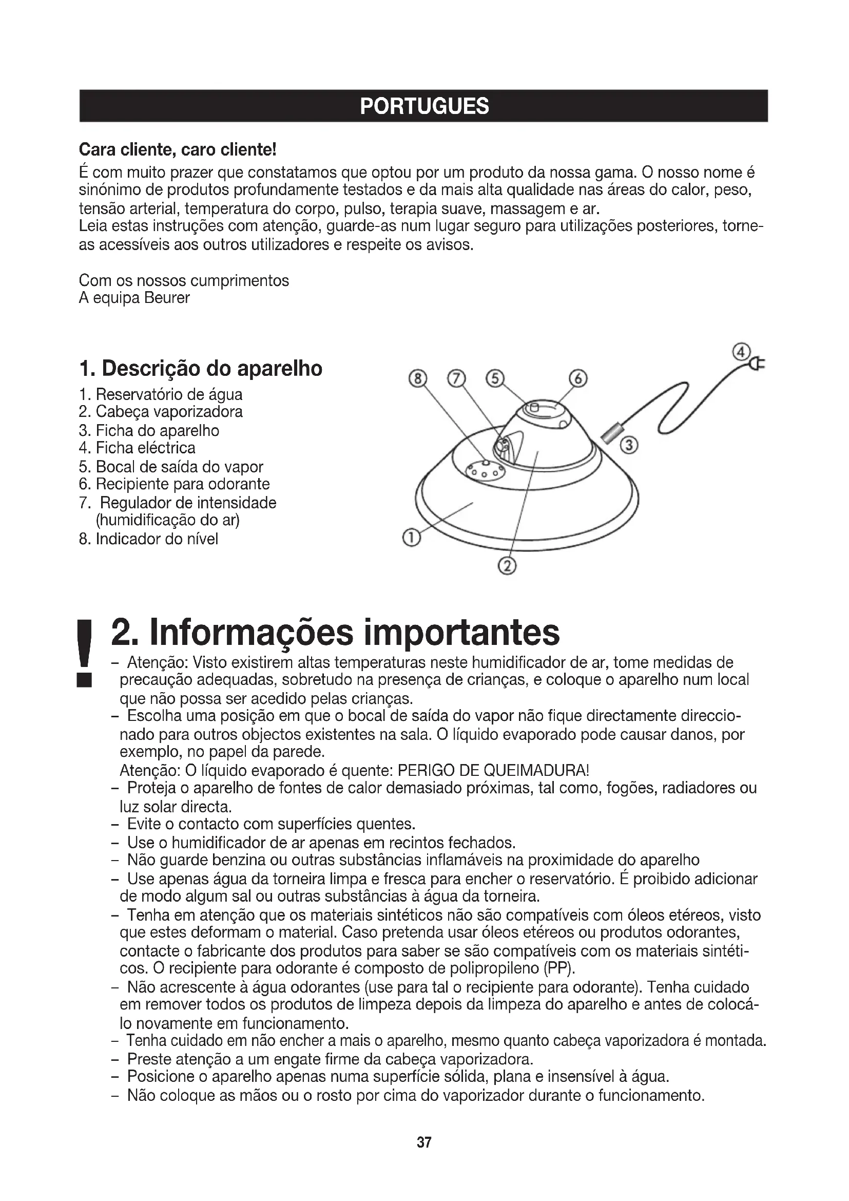 Verwijder het toestel conform het Besluit Afval van Elektrische en Elektronische Apparaten 2002/96/EC – WEEE (Waste Electrical and Electronic Equipment). Voor nadere informatie kunt u zich richten tot de bevoegde instanties voor afvalverwijdering.37 PORTUGUES Cara cliente, caro cliente! É com muito prazer que constatamos que optou por um produto da nossa gama. O nosso nome é sinónimo de produtos profundamente testados e da mais alta qualidade nas áreas do calor, peso, tensão arterial, temperatura do corpo, pulso, terapia suave, massagem e ar. Leia estas instruções com atenção, guarde-as num lugar seguro para utilizações posteriores, torne- as acessíveis aos outros utilizadores e respeite os avisos. Com os nossos cumprimentos A equipa Beurer