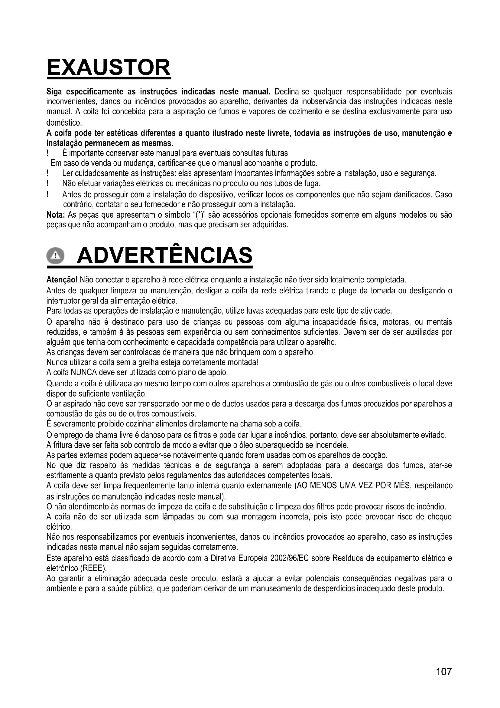 - EMC: EN 55014-1; CISPR 14-1; EN 55014-2; CISPR 14-2; EN/IEC 61000-3-2; EN/IEC 61000-3-3. Sugestões para uma utilização correta, de modo a reduzir o impacto ambiental: LIGUE a coifa na velocidade mínima quando começar a cozinhar e mantenha-a em função por mais alguns minutos após ter terminado. Aumente a velocidade somente em caso de muita fumaça ou vapor e use as velocidades altas somente em situações extremas. Substitua o(s) filtro(s) a carvão quando necessário, para manter uma boa eficiência na redução dos odores. Limpe o(s) filtro(s) para gordura quando necessário para manter uma boa eficiência do filtro para gordura. Use o diâmetro máximo do sistema de condutas indicado neste manual para otimizar a eficiência e minimizar o ruído. ATENÇÃO! A não instalação dos parafusos e elementos de fixação, conforme estas instruções, pode resultar em riscos elétricos. USO A coifa é fabricada para ser utilizada na versão aspirante, com exaustão externa do ar, ou filtrante, com recirculação interna. Versão aspirante Os vapores são evacuados para o exterior por meio de um tubo de descarga fixado á flange de conexão que se encontra sobre o exaustor. O diâmetro do tubo de descarga deve ser equivalente ao diâmetro do anel de conexão. Na parte horizontal o tubo deve ter uma leve inclinação para cima (cerca de 10°) de modo a poder transportar o ar para fora mais facilmente. Se o exaustor for dotada de filtros de carvão ativo, estes deverão ser tirados. Conectar a coifa ao tubos e orifícios de descarga de parede com diâmetro equivalente à saída de ar (flange de união). O uso de tubos ou orifícios de descarga de parede com diâmetro inferior pode provocar a diminuição da performance de aspiração e um drástico aumento do ruído. Não nos responsabilizamos a este respeito. ! Utilizar um tubo condutor com o comprimento não inferior ao indicado. ! Utilizar um tubo condutor com o menor número possível de curvas (ângulo máximo da curva: 90ºC 90°). ! Evitar alterações drásticas da seção do tubo (diâmetro). ! Usar um tubo condutor com o interior mais liso possível. ! O material do tubo condutor deve ser aprovado e estar em conformidade com a lei. Versão filtrante Deve ser utilizado um filtro de carvão ativo, disponível junto ao seu revendedor. O ar aspirado será desengordurado e desodorizado antes de ser reintroduzido no ambiente através da grelha superior.109 INSTALAÇÃO A distância mínima entre a superfície de suporte dos recipientes sobre o fogão e a parte mais baixa da coifa não deve ser inferior a 45cm no caso de fogões elétricos e 50cm no caso de fogões a gás ou combinados. Se as instruções de instalação do fogão a gás especificarem uma distância maior, deve-se levar em conta esta indicação. Conexão elétrica A voltagem da rede elétrica deve corresponder à voltagem indicada na etiqueta das características situada no interior da coifa. Se dotada de ficha, conectar a coifa a uma tomada em conformidade com as normas vigentes posta em zona acessível,mesmo depois da instalação. Se não dotada de ficha (conexão direta à rede) ou a tomada não se encontra em zona acessível,mesmo depois da instalação, aplicar um interruptor bipolar em conformidade com a norma que assegure a desconexão completa da rede nas condições da categoria de sobretensão III, conformemente às regras de instalação. Atenção! Antes de conectar novamente o circuito da coifa com a alimentação elétrica, verificar seu funcionamento, atentar sempre para que o cabo de rede esteja montado corretamente. O exaustor está equipado com um cabo de alimentação especial; no caso do cabo ficar danificado, efectuar um pedido ao serviço de assistência técnica. Montagem Produto com peso excessivo. A movimentação e a instalação do exaustor devem ser feitas por pelo menos duas ou mais pessoas. Antes de iniciar a instalação: