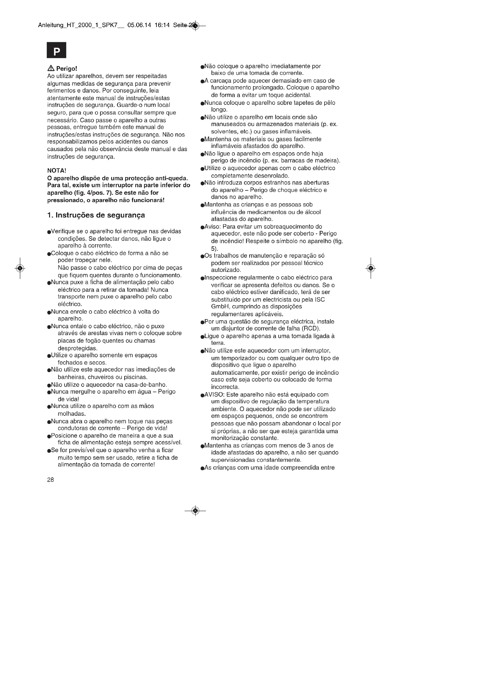 Anleitung_HT_2000_1_SPK7__ 05.06.14 16:14 Seite 27 Perigo! Ao utilizar aparelhos, devem ser respeitadas algumas medidas de segurança para prevenir ferimentos e danos. Por conseguinte, leia atentamente este manual de instruções/estas instruções de segurança. Guarde-o num local seguro, para que o possa consultar sempre que necessário. Caso passe o aparelho a outras pessoas, entregue também este manual de instruções/estas instruções de segurança. Não nos responsabilizamos pelos acidentes ou danos causados pela não observância deste manual e das instruções de segurança. NOTA! O aparelho dispõe de uma protecção anti-queda. Para tal, existe um interruptor na parte inferior do aparelho (fig. 4/pos. 7). Se este não for pressionado, o aparelho não funcionará!