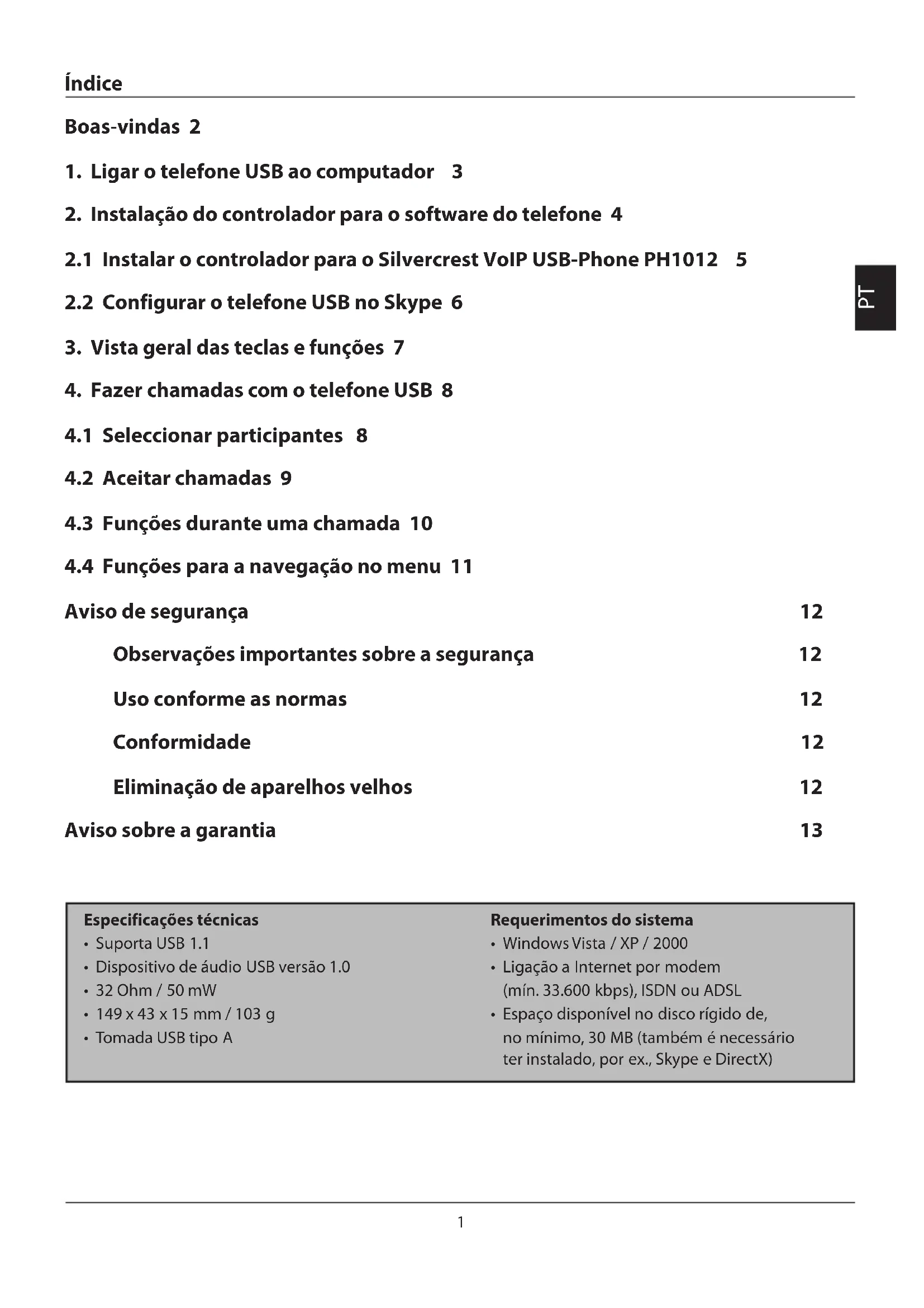 - Tomada USB tipo A no mínimo, 30 MB (também é necessário ter instalado, por ex., Skype e DirectX)2 Boas-vindas Estas instruções mostram como instalar e utilizar o telefone Silvercrest VoIP USB-Phone PH1012. Esse telefone USB permite-lhe fazer chamadas „Voice over IP“ por Internet com a mesma comodidade que oferece um aparelho de telefone convencional. Para poder utilizar o seu telefone USB Silvercrest deverá ter instalado no seu computador o software de telefone Skype. De seguida, deverá ser instalado o controlador para o telefone USB para que este possa ser operado junto com o software do Skype. O controlador anexo amplia o software do Skype com as funções do telefone USB, não significando, no entanto, que seja um controlador para o software do telefone. Antes da instalação por favor, verificar se o software do Skype está instalado correctamente no seu computador. Do mesmo modo, deverá estar registado no Skype como cliente para que possa fazer chamadas através da Internet. Apenas assim será possível garantir a instalação correcta do controlador do telefone USB. Siga estas instruções de instalação passo a passo para que o telefone USB seja instalado sem falhas no seu computador. Tenha em conta também os avisos de segurança no final do documento. Conteúdo do pacote: – Telefone USB com cabo de ligação – Cabo de extensão USB – CD do controlador – Manual3
