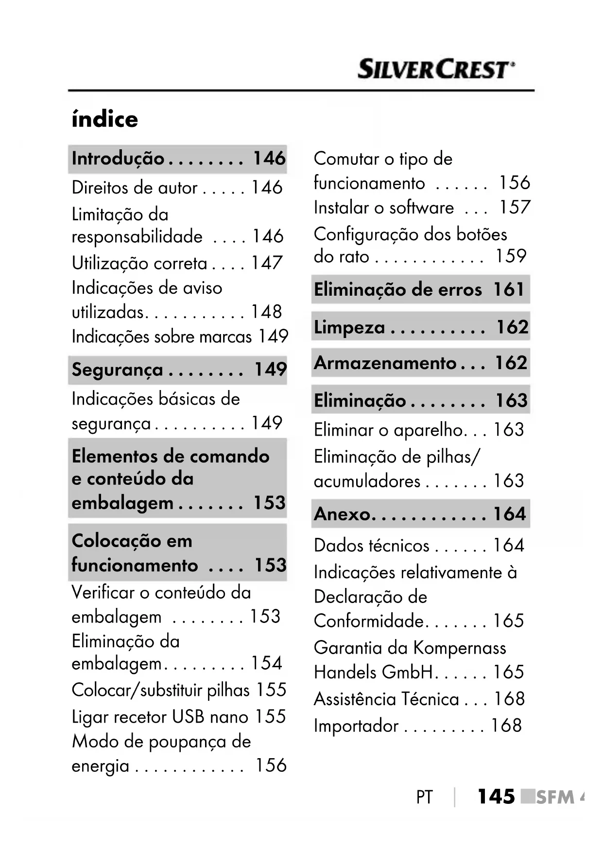 147 ■SFM 4 A1 Excluem-se os direitos relativos a dados, ilustrações e descrições presentes neste manual de instruções. O fabricante não assume qualquer responsabilidade por danos resultantes da inobservância do manual de instruções, de uma utilização incorreta, de reparações inadequadas, de alterações não autorizadas ou da utilização de peças de reposição não aprovadas. Utilização correta Este rato sem fios é um aparelho da tecnologia de informação e funciona como dispositivo de entrada de dados para um computador. Este aparelho não pode ser utilizado fora de espaços fechados. Este aparelho não foi concebido para a utilização em empresas ou a utili- zação comercial (p. ex. utilização em escritórios). Utilize o aparelho exclusivamente na área habitacional para fins privados. Qualquer utilização diferente ou fora do âmbito descrito é considerada incorreta. Estão excluídos quaisquer direitos de garantia relativos a danos resultan- tes de uma utilização incorreta. O risco é da responsabi- lidade exclusiva do utilizador.■ 148