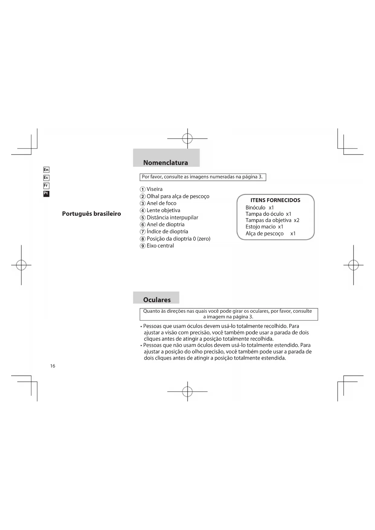 Pessoasquenãousamóculosdevemusá-lototalmenteestendido.Para ajustaraposiçãodoolhoprecisão,vocêtambémpodeusaraparadade doiscliquesantesdeatingiraposiçãototalmenteestendida. Oculares Quantoàsdireçõesnasquaisvocêpodegirarosoculares,porfavor,consulte a imagem na página 3. Por favor, consulte as imagens numeradas na página 3. Binóculo x1 Tampa do óculo x1 Tampas da objetiva x2 Estojo macio x1 Alçadepescoço x1 ITENS FORNECIDOS17