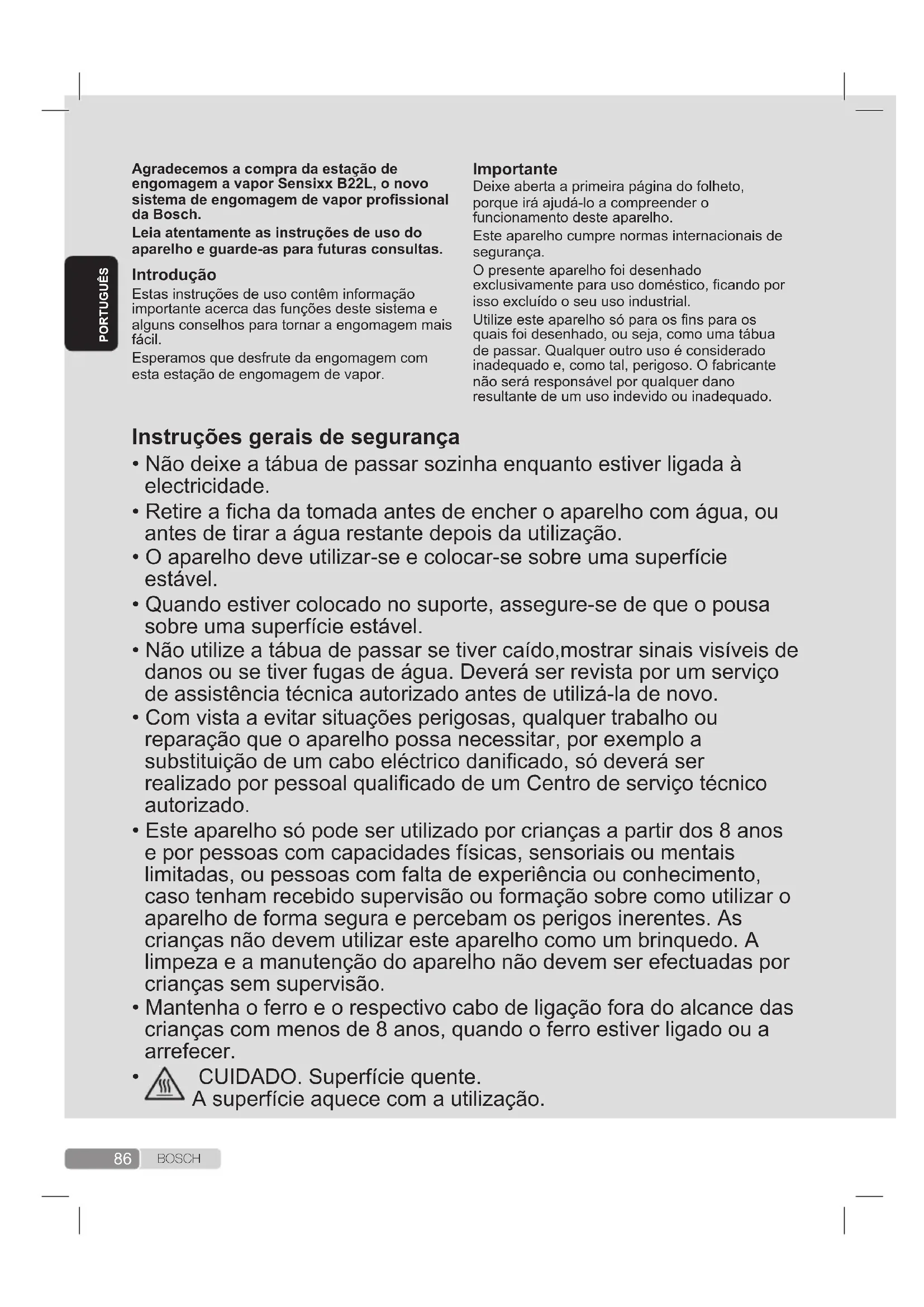 Estas instruções de uso contêm informação importante acerca das funções deste sistema e alguns conselhos para tornar a engomagem mais fácil. Esperamos que desfrute da engomagem com esta estação de engomagem de vapor.