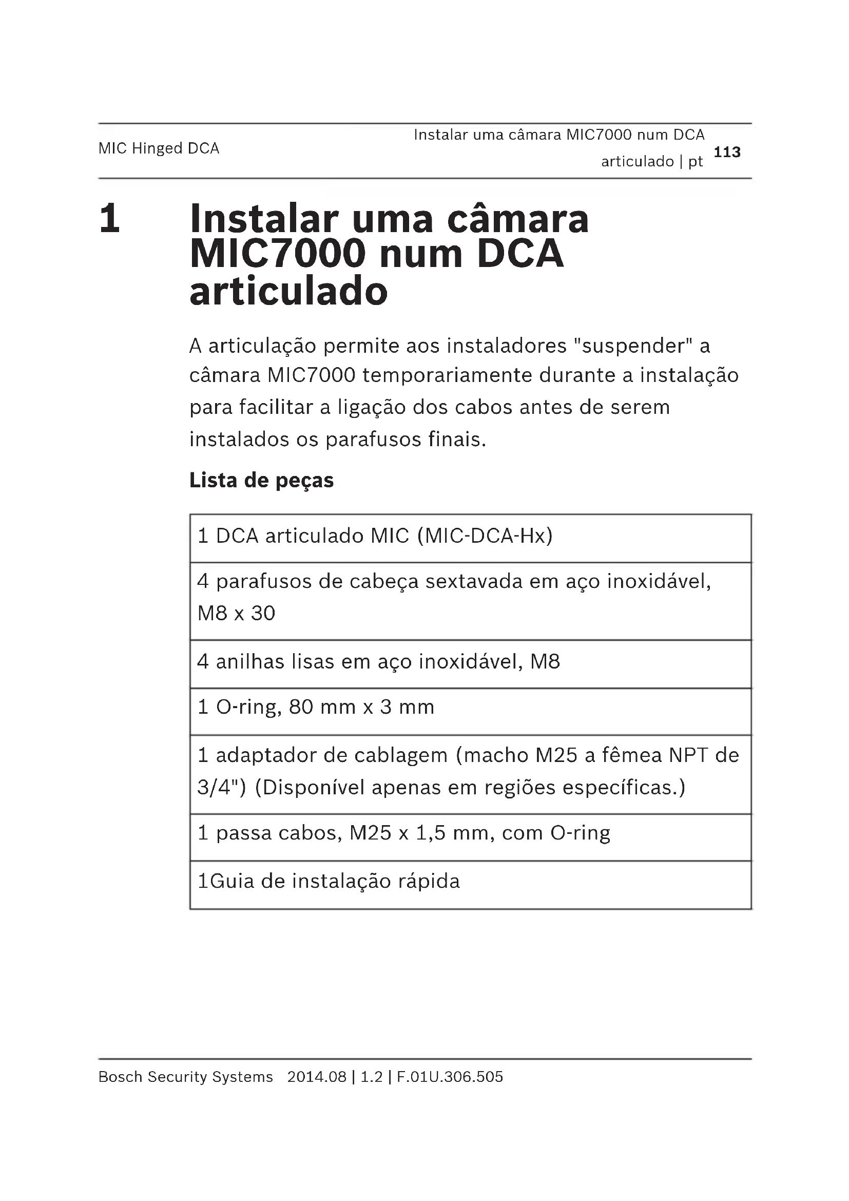 pl | Montaż kamery MIC7000 na uchylnym głębokim przepuście kablowym MIC Hinged DCA 2014.08 | 1.2 | F.01U.306.505 Bosch Security SystemsInstalar uma câmara MIC7000 num DCA articulado A articulação permite aos instaladores "suspender" a câmara MIC7000 temporariamente durante a instalação para facilitar a ligação dos cabos antes de serem instalados os parafusos finais. Lista de peças 1 DCA articulado MIC (MIC-DCA-Hx) 4 parafusos de cabeça sextavada em aço inoxidável, M8 x 30 4 anilhas lisas em aço inoxidável, M8 1 O-ring, 80 mm x 3 mm 1 adaptador de cablagem (macho M25 a fêmea NPT de 3/4") (Disponível apenas em regiões específicas.) 1 passa cabos, M25 x 1,5 mm, com O-ring 1Guia de instalação rápida