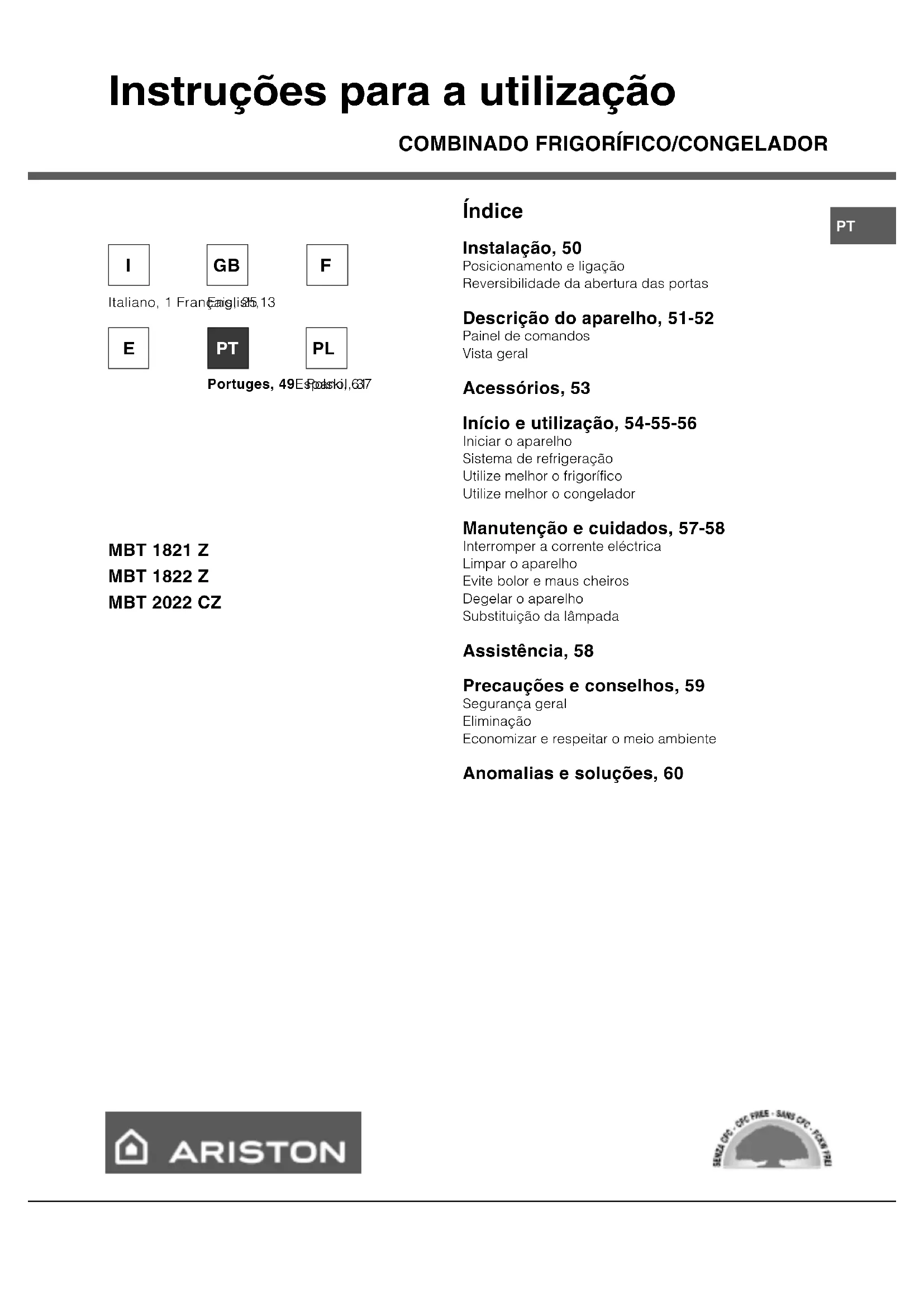 MBT 1821 Z MBT 1822 Z MBT 2022 CZ Índice Instalação, 50 Posicionamento e ligação Reversibilidade da abertura das portas Descrição do aparelho, 51-52 Painel de comandos Vista geral Acessórios, 53 Início e utilização, 54-55-56 Iniciar o aparelho Sistema de refrigeração Utilize melhor o frigorífico Utilize melhor o congelador Manutenção e cuidados, 57-58 Interromper a corrente eléctrica Limpar o aparelho Evite bolor e maus cheiros Degelar o aparelho Substituição da lâmpada Assistência, 58 Precauções e conselhos, 59 Segurança geral Eliminação Economizar e respeitar o meio ambiente Anomalias e soluções, 60 Polski, 61 PL50