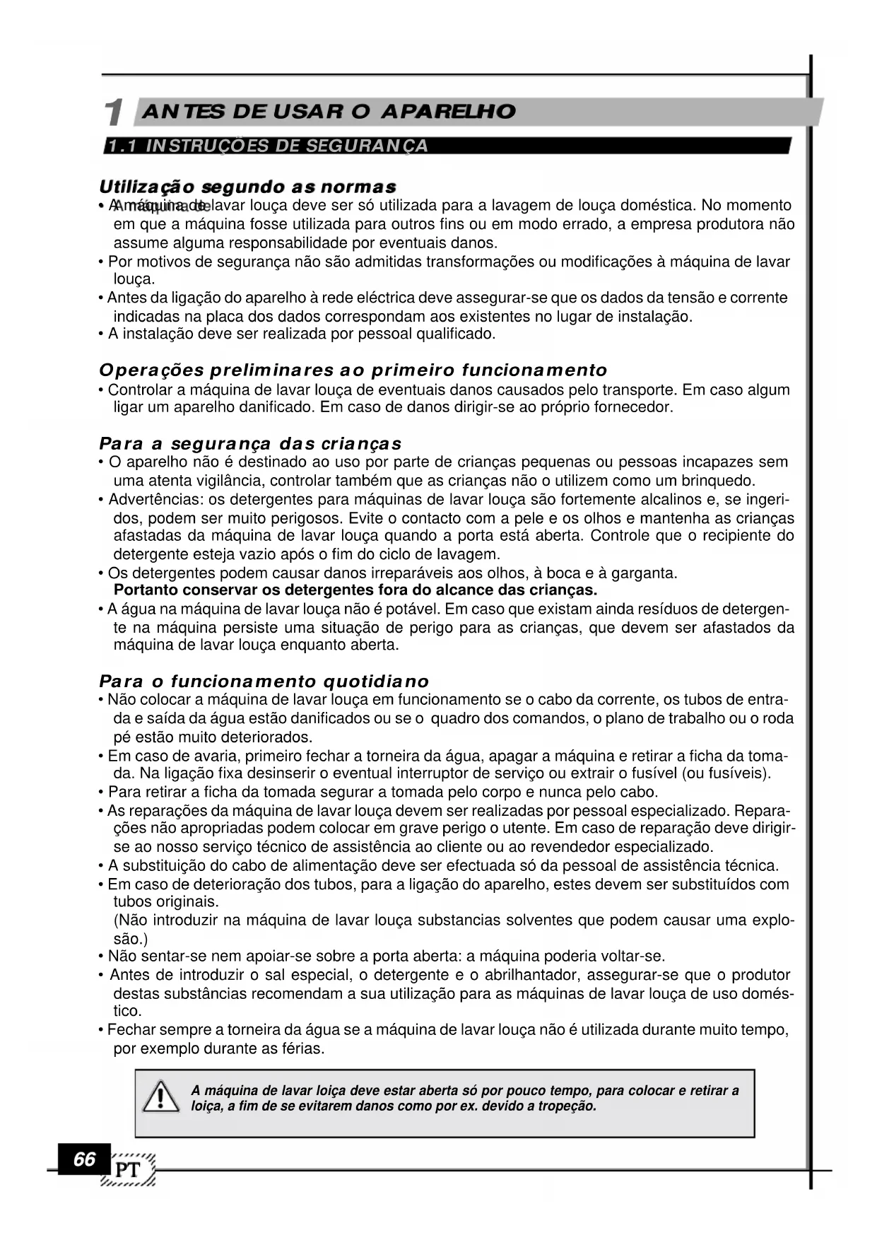 - O aparelho não é destinado ao uso por parte de crianças pequenas ou pessoas incapazes semuma atenta vigilância, controlar também que as crianças não o utilizem como um brinquedo.• Advertências: os detergentes para máquinas de lavar louça são fortemente alcalinos e, se ingeri-dos, podem ser muito perigosos. Evite o contacto com a pele e os olhos e mantenha as criançasafastadas da máquina de lavar louça quando a porta está aberta. Controle que o recipiente dodetergente esteja vazio após o fim do ciclo de lavagem.• Os detergentes podem causar danos irreparáveis aos olhos, à boca e à garganta.Portanto conservar os detergentes fora do alcance das crianças.• A água na máquina de lavar louça não é potável. Em caso que existam ainda resíduos de detergen-te na máquina persiste uma situação de perigo para as crianças, que devem ser afastados damáquina de lavar louça enquanto aberta. Para o funcionamento quotidiano