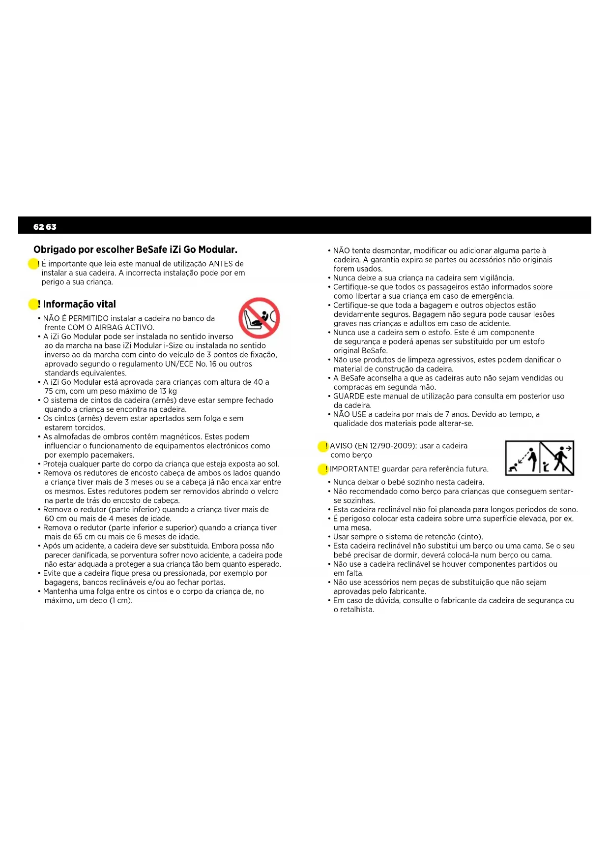 - Mantenha uma folga entre os cintos e o corpo da criança de, no máximo, um dedo (1 cm). Obrigado por escolher BeSafe iZi Go Modular. ! É importante que leia este manual de utilização ANTES de instalar a sua cadeira. A incorrecta instalação pode por em perigo a sua criança.