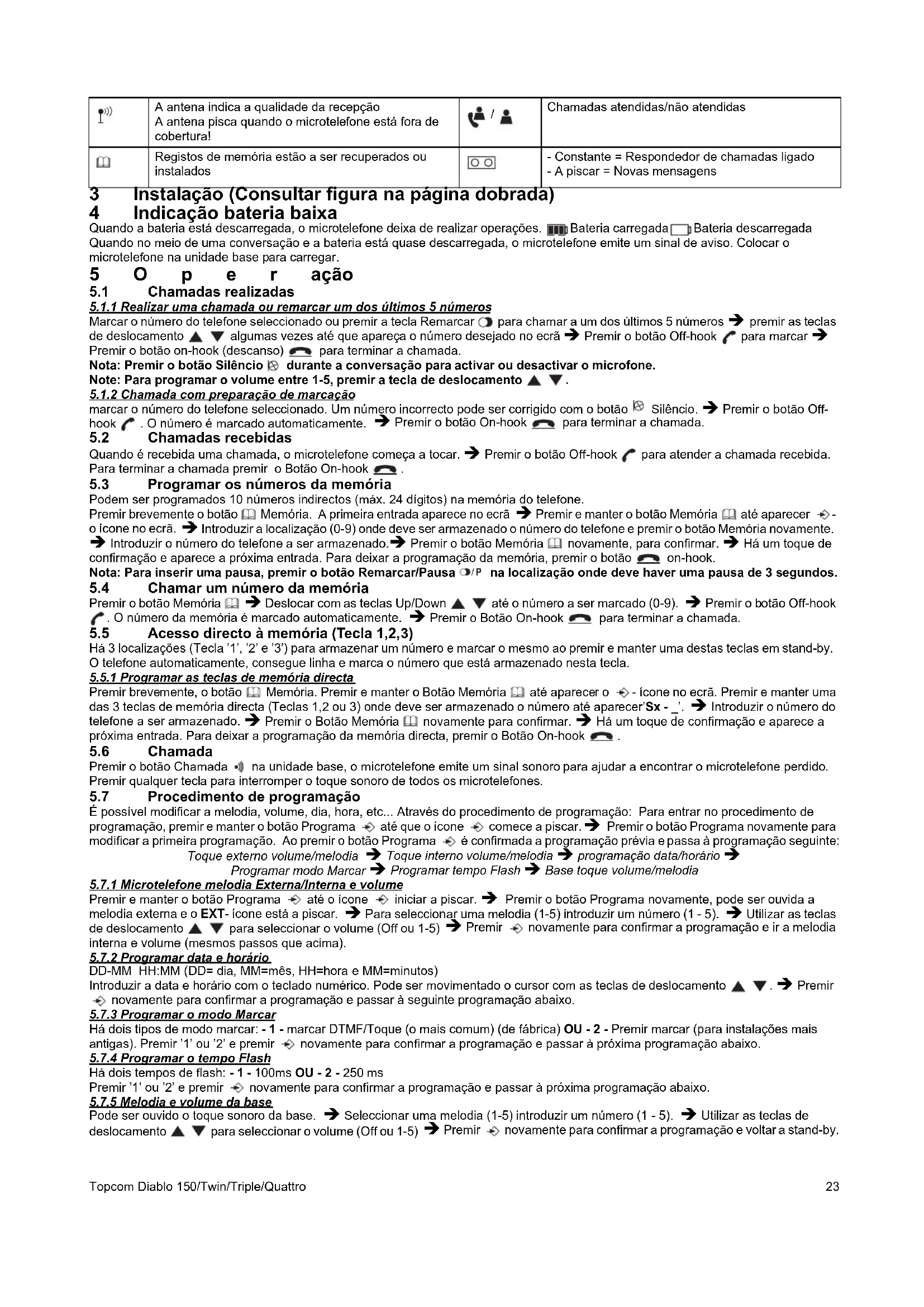 /PTopcom Diablo 150/Twin/Triple/Quattro 23 3 Instalação (Consultar figura na página dobrada) 4Indicação bateria baixa Quando a bateria está descarregada, o microtelefone deixa de realizar operações. Bateria carregada Bateria descarregada Quando no meio de uma conversação e a bateria está quase descarregada, o microtelefone emite um sinal de aviso. Colocar o microtelefone na unidade base p ara carregar. 5Operação