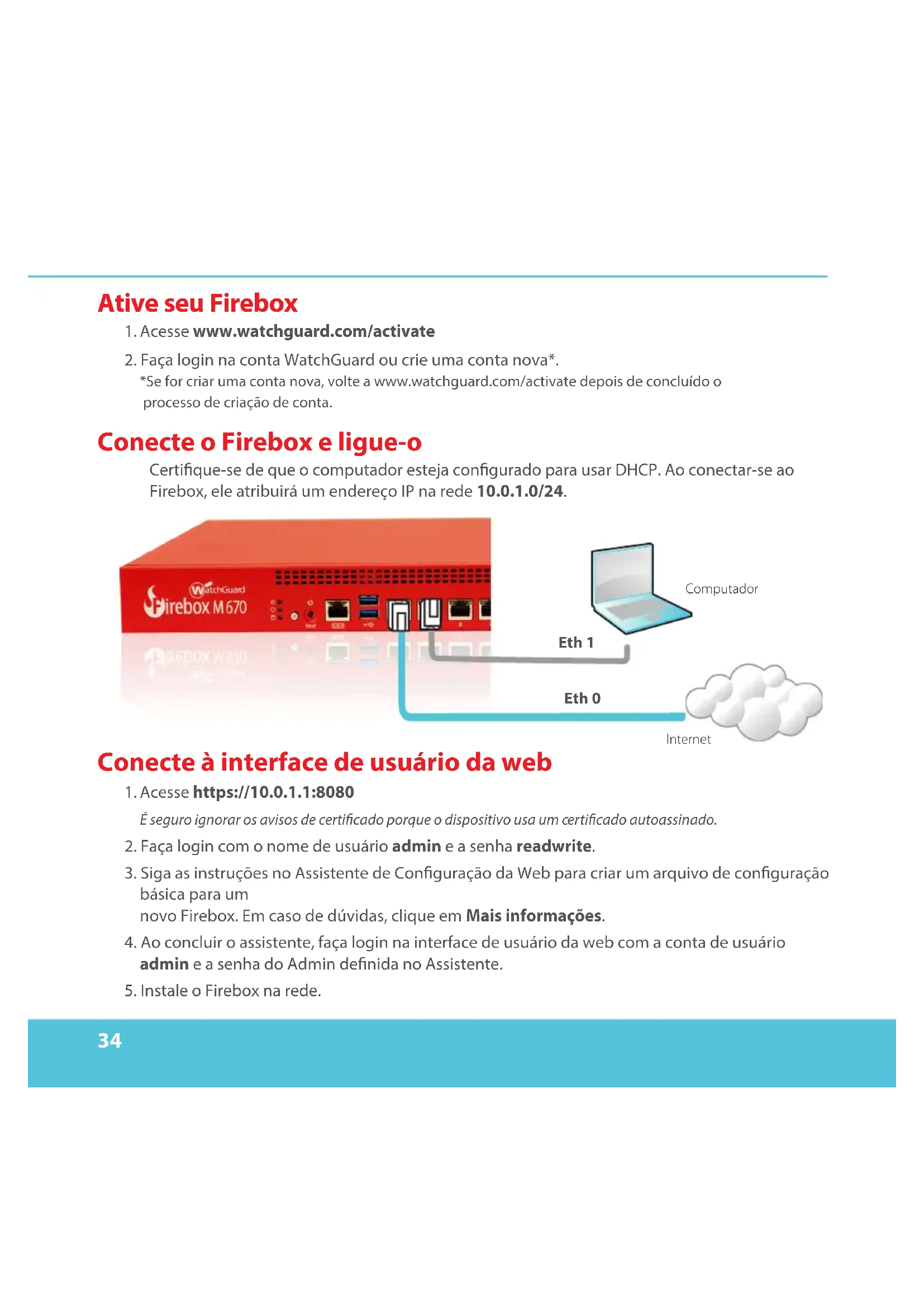 *Se for criar uma conta nova, volte a www.watchguard.com/activate depois de concluído o processo de criação de conta. Conecte o Firebox e ligue-o Certique-se de que o computador esteja congurado para usar DHCP. Ao conectar-se ao Firebox, ele atribuirá um endereço IP na rede 10.0.1.0/24. Conecte à interface de usuário da web