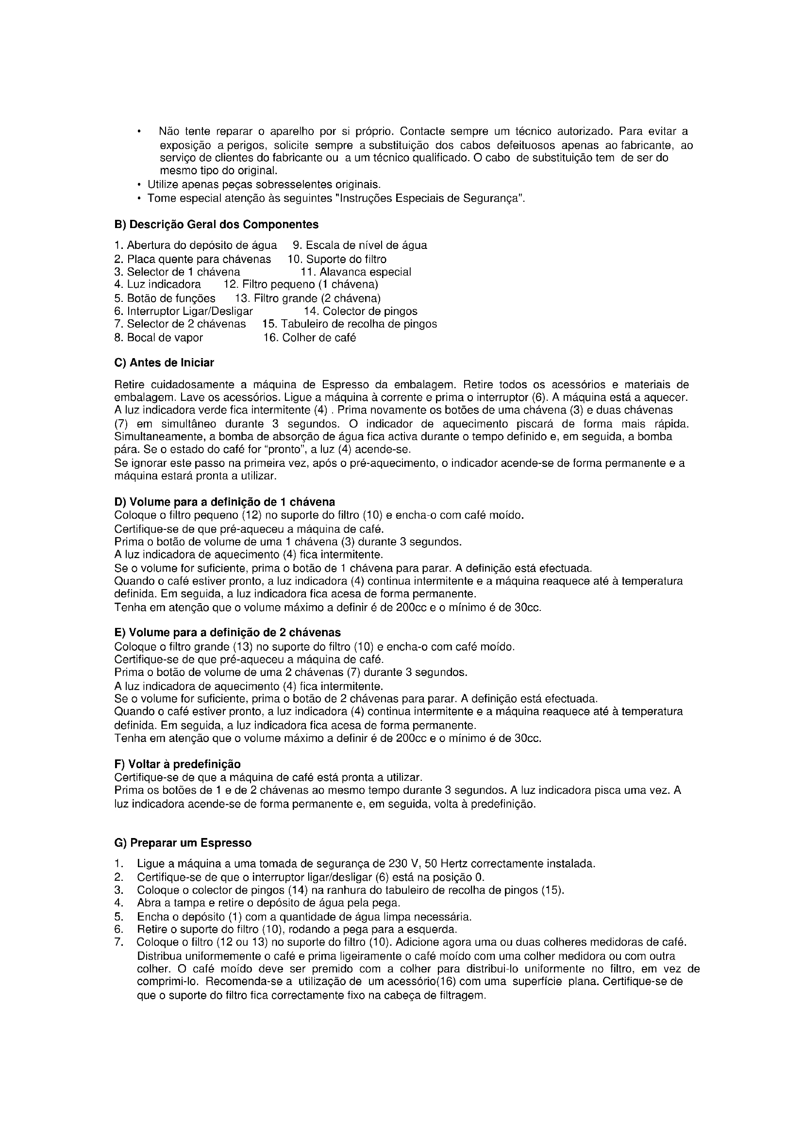 C) Antes de Iniciar Retire cuidadosamente a máquina de Espresso da embalagem. Retire todos os acessórios e materiais de embalagem. Lave os acessórios. Ligue a máquina à corrente e prima o interruptor (6). A máquina está a aquecer. A luz indicadora verde fica intermitente (4) . Prima novamente os botões de uma chávena (3) e duas chávenas (7) em simultâneo durante 3 segundos. O indicador de aquecimento piscará de forma mais rápida. Simultaneamente, a bomba de absorção de água fica activa durante o tempo definido e, em seguida, a bomba pára. Se o estado do café for “pronto”, a luz (4) acende-se. Se ignorar este passo na primeira vez, após o pré-aquecimento, o indicador acende-se de forma permanente e a máquina estará pronta a utilizar. D) Volume para a definição de 1 chávena Coloque o filtro pequeno (12) no suporte do filtro (10) e encha-o com café moído. Certifique-se de que pré-aqueceu a máquina de café. Prima o botão de volume de uma 1 chávena (3) durante 3 segundos. A luz indicadora de aquecimento (4) fica intermitente. Se o volume for suficiente, prima o botão de 1 chávena para parar. A definição está efectuada. Quando o café estiver pronto, a luz indicadora (4) continua intermitente e a máquina reaquece até à temperatura definida. Em seguida, a luz indicadora fica acesa de forma permanente. Tenha em atenção que o volume máximo a definir é de 200cc e o mínimo é de 30cc. E) Volume para a definição de 2 chávenas Coloque o filtro grande (13) no suporte do filtro (10) e encha-o com café moído. Certifique-se de que pré-aqueceu a máquina de café. Prima o botão de volume de uma 2 chávenas (7) durante 3 segundos. A luz indicadora de aquecimento (4) fica intermitente. Se o volume for suficiente, prima o botão de 2 chávenas para parar. A definição está efectuada. Quando o café estiver pronto, a luz indicadora (4) continua intermitente e a máquina reaquece até à temperatura definida. Em seguida, a luz indicadora fica acesa de forma permanente. Tenha em atenção que o volume máximo a definir é de 200cc e o mínimo é de 30cc. F) Voltar à predefinição Certifique-se de que a máquina de café está pronta a utilizar. Prima os botões de 1 e de 2 chávenas ao mesmo tempo durante 3 segundos. A luz indicadora pisca uma vez. A luz indicadora acende-se de forma permanente e, em seguida, volta à predefinição.