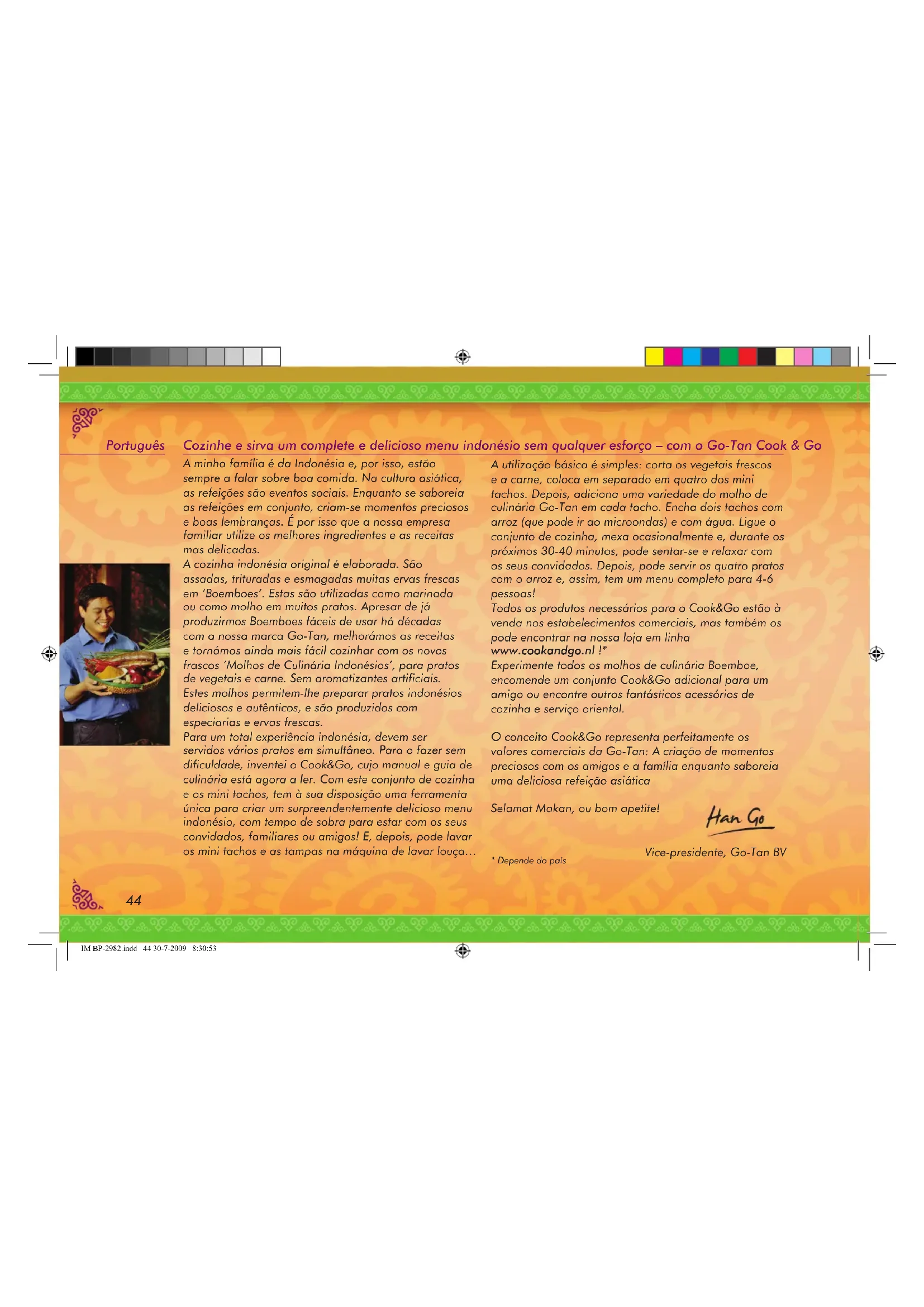 IM BP-2982.indd 43 30-7-2009 8:30:5144 A minha família é da Indonésia e, por isso, estão sempre a falar sobre boa comida. Na cultura asiática, as refeições são eventos sociais. Enquanto se saboreia as refeições em conjunto, criam-se momentos preciosos e boas lembranças. É por isso que a nossa empresa familiar utilize os melhores ingredientes e as receitas mas delicadas. A cozinha indonésia original é elaborada. São assadas, trituradas e esmagadas muitas ervas frescas em ‘Boemboes’. Estas são utilizadas como marinada ou como molho em muitos pratos. Apresar de já produzirmos Boemboes fáceis de usar há décadas com a nossa marca Go-Tan, melhorámos as receitas e tornámos ainda mais fácil cozinhar com os novos frascos ‘Molhos de Culinária Indonésios’, para pratos de vegetais e carne. Sem aromatizantes artificiais. Estes molhos permitem-lhe preparar pratos indonésios deliciosos e autênticos, e são produzidos com especiarias e ervas frescas. Para um total experiência indonésia, devem ser servidos vários pratos em simultâneo. Para o fazer sem dificuldade, inventei o Cook&Go, cujo manual e guia de culinária está agora a ler. Com este conjunto de cozinha e os mini tachos, tem à sua disposição uma ferramenta única para criar um surpreendentemente delicioso menu indonésio, com tempo de sobra para estar com os seus convidados, familiares ou amigos! E, depois, pode lavar os mini tachos e as tampas na máquina de lavar louça… A utilização básica é simples: corta os vegetais frescos e a carne, coloca em separado em quatro dos mini tachos. Depois, adiciona uma variedade do molho de culinária Go-Tan em cada tacho. Encha dois tachos com arroz (que pode ir ao microondas) e com água. Ligue o conjunto de cozinha, mexa ocasionalmente e, durante os próximos 30-40 minutos, pode sentar-se e relaxar com os seus convidados. Depois, pode servir os quatro pratos com o arroz e, assim, tem um menu completo para 4-6 pessoas! Todos os produtos necessários para o Cook&Go estão à venda nos estabelecimentos comerciais, mas também os pode encontrar na nossa loja em linha www.cookandgo.nl !* Experimente todos os molhos de culinária Boemboe, encomende um conjunto Cook&Go adicional para um amigo ou encontre outros fantásticos acessórios de cozinha e serviço oriental. O conceito Cook&Go representa perfeitamente os valores comerciais da Go-Tan: A criação de momentos preciosos com os amigos e a família enquanto saboreia uma deliciosa refeição asiática Selamat Makan, ou bom apetite! Vice-presidente, Go-Tan BV