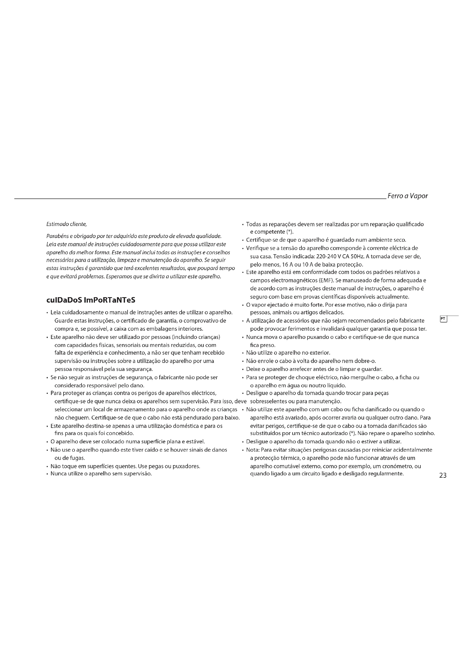 - Este aparelho está em conformidade com todos os padrões relativos a campos electromagnéticos (EMF). Se manuseado de forma adequada e de acordo com as instruções deste manual de instruções, o aparelho é seguro com base em provas cientícas disponíveis actualmente.