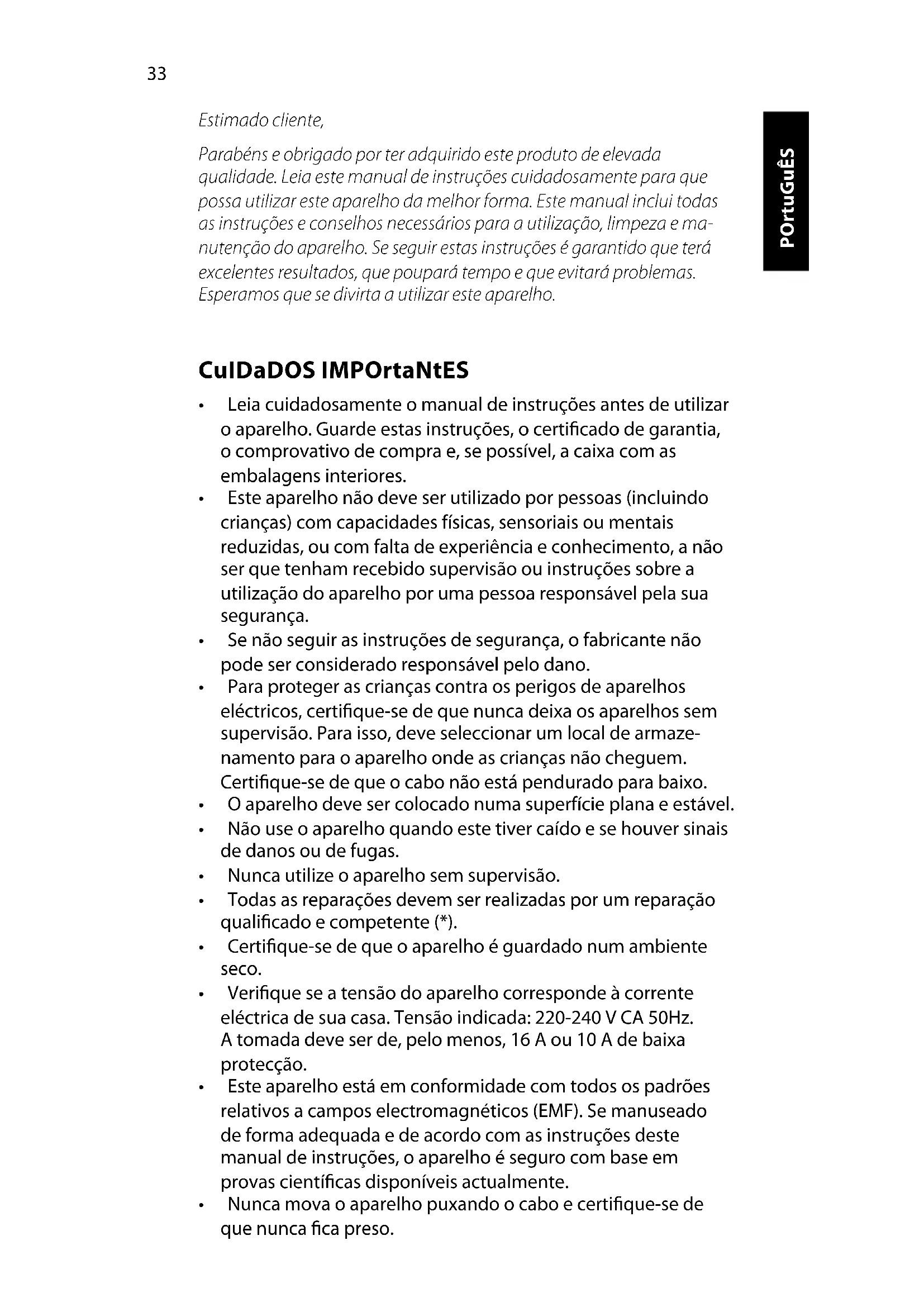 - Este aparelho está em conformidade com todos os padrões relativos a campos electromagnéticos (EMF). Se manuseado de forma adequada e de acordo com as instruções deste manual de instruções, o aparelho é seguro com base em provas cientícas disponíveis actualmente.