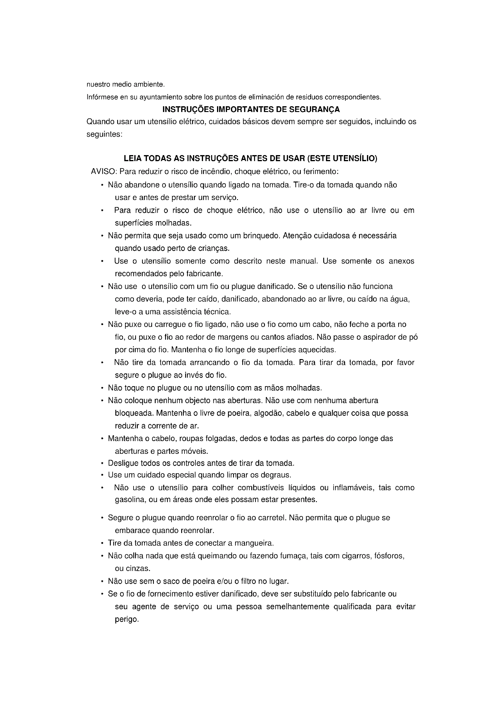 - Não use sem o saco de poeira e/ou o filtro no lugar.