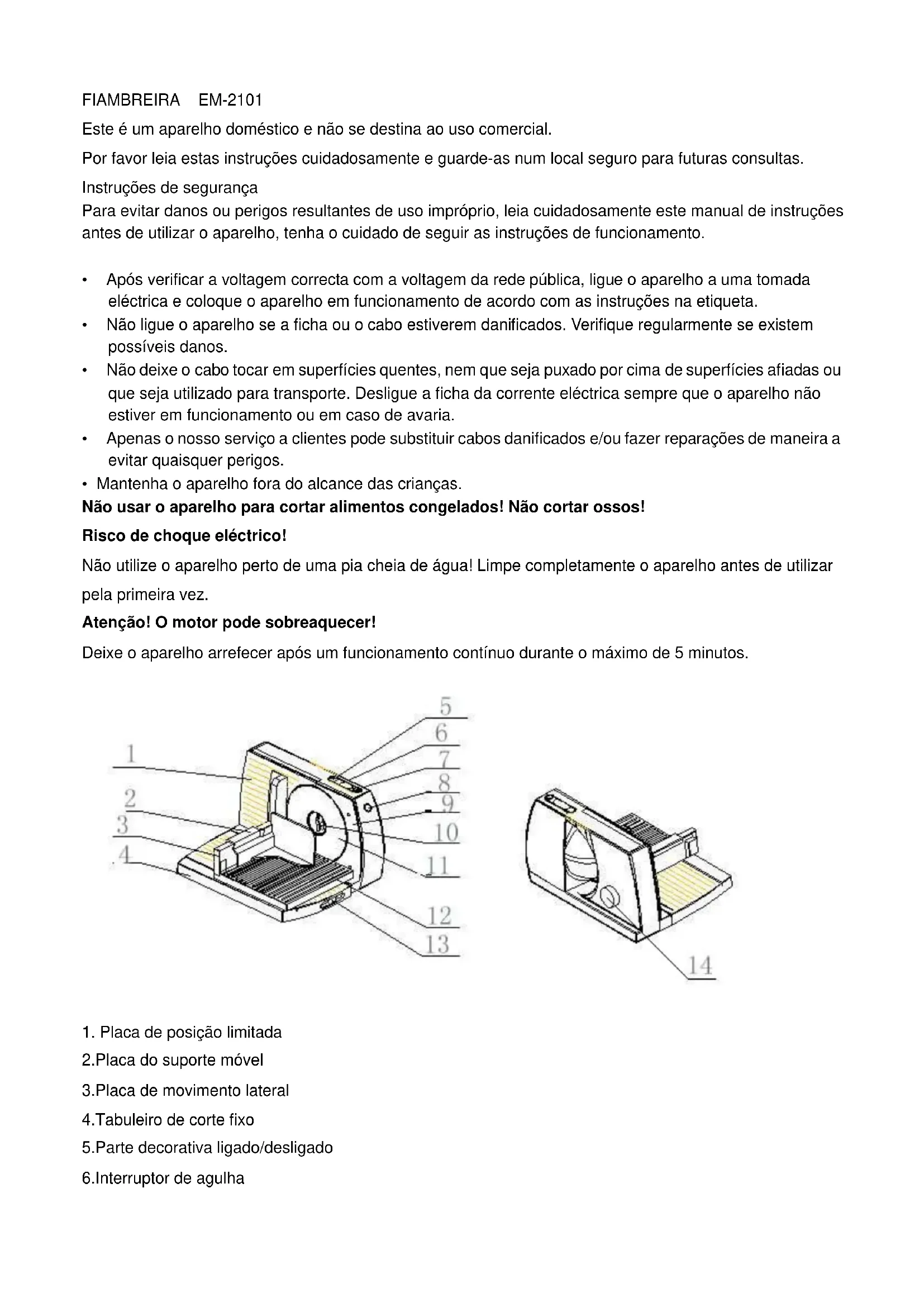 14.Botão Descrição geral: Nome do produto: fiambreira Modelo do produto: HC3001/EM-2101 Potência: 230V~, 50Hz, 120W Lâmina de 170mm de diâmetro em aço inoxidável. Espessura de corte: <1,5 cm Instruções de funcionamento Coloque o aparelho numa superfície lisa, baixe a mesa e o botão de bloqueio (13) Monte a bandeja de recolha, coloque a placa de movimento lateral (3) na vertical na ranhura lateral e coloque na mesa. Junte a placa do suporte móvel (2) à placa de movimento lateral (3). Ajuste a espessura do corte com o botão (14) Funcionamento momentâneo: Prima o interruptor de protecção Ajuste o interruptor de agulha para obter a velocidade de rotação escolhida. Prima o botão de protecção, depois prima o botão ON/OFF (ligar/desligar) até o aparelho estar a funcionar. Para parar de funcionar, prima o botão de protecção e solte o botão ligar/desligar. Cuidado: Não ajuste o interruptor móvel enquanto o aparelho está a funcionar. Risco de lesão com a lâmina afiada - A lâmina continua a rodar por algum tempo quando o aparelho é desligado. - Nunca coloque as mãos perto da lâmina. Controlo da velocidade Controla a velocidade de corte. Se o alimento for muito suave (ex.: queijo), coloque a velocidade no MIN (mínimo). Utilize sempre a bandeja de recolha e o suporte de restos! Não retire a bandeja de recolha e o suporte de restos, excepto se o tamanho e forma do alimento a sercortado impedir o uso da bandeja e suporte de restos. Sugestão: Corte primeiro salsicha e queijo e pão em último: O aparelho é mais fácil de limpar. Após a utilização e limpeza imediata do aparelho, solte a mesa e feche o aparelho. Enrole o cabo e bloqueie a ficha na posição. Mantenha afastado do alcance de crianças.: A lâmina afiada pode causar ferimentos. Desligue a ficha e remova a lâmina antes de limpar. Toque apenas no botão fixo. Nunca toque na extremidade de corte. Atenção! As superfícies podem danificar-se. Não utilize detergentes agressivos. Limpe o aparelho e os acessórios com um pano húmido e deixe secar. Limpar a lâmina circular Tenha cuidado pois esta lâmina é muito afiada. Limpe cuidadosamente a lâmina circular sempre que terminar de utilizar e apenas à mão. Rode o suporte da lâmina na direcção dos ponteiros do relógio, coloque na vertical e retire a lâmina circular. Se a lâmina estiver muito suja, pode retirar a cobertura da lâmina, começando pela extremidade exterior. Quando voltar a colocar a lâmina, assegure-se que fica correctamente presa na sua posição=botão fixo na posição horizontal. ! Risco de lesão com a lâmina afiada Garantia As condições de garantia para este aparelho são definidas pelo nosso representante no país onde é vendido. Pode obter os detalhes relacionados com estas condições no vendedor onde adquiriu o aparelho. Deve ser criada a prova de compra ou recibo quando fizer alguma reclamação sob os termos desta garantia.CORTAFIAMBRES EM-2101 Este electrodoméstico está diseñado para su uso doméstico, no comercial. Lea detenidamente las instrucciones de uso y consérvelas en un lugar seguro para futuras consultas. Instrucciones de seguridad Para evitar daños o riesgos como consecuencia de uso incorrecto, lea este manual de instrucciones cuidadosamente antes de utilizar el electrodoméstico y asegúrese de seguir las instrucciones de uso.