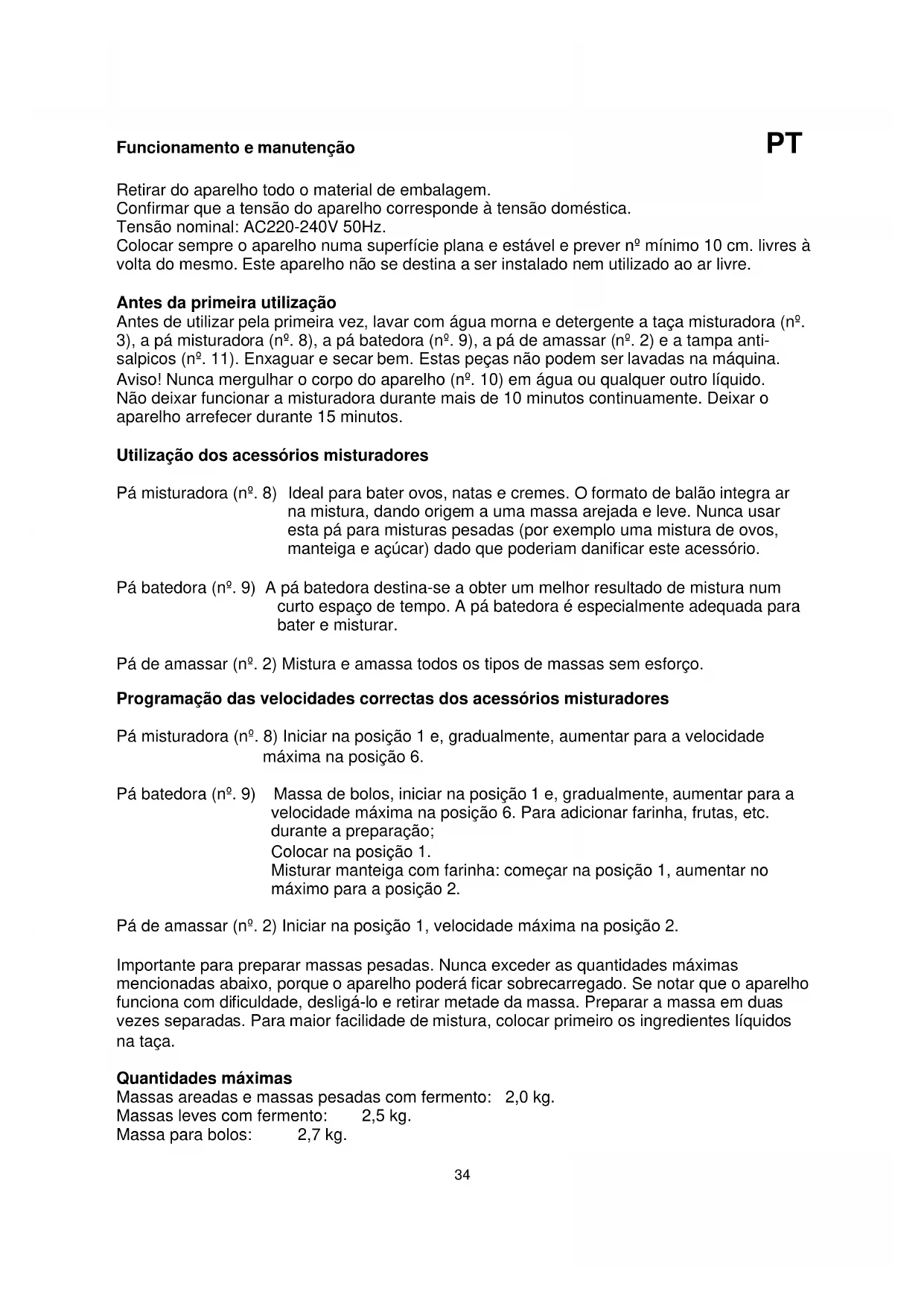 Linee guida per la protezione dell’ambiente Questo dispositivo non dovrebbe essere inserito nella spazzatura domestica alla fine del suo ciclo di vita, ma deve essere smaltito presso un punto centrale per il riciclo dei dispositivi domestici elettrici ed elettronici. Questo simbolo sul dispositivo, sul manuale d’istruzioni e sull’imballaggio centra la vostra attenzione su questo importante argomento. I materiali usati in questo dispositivo possono essere riciclati. Riciclando i dispositivi domestici usati contribuite a dare una spinta importante alla protezione del nostro ambiente. Chiedere alle autorità locali per informazioni inerenti i punti di raccolta. Imballaggio L’imballaggio è riciclabile al 100%, riportare l’imballaggio separatamente. Prodotto Questo dispositivo è dotato di un marchio secondo la Normativa Europea 2002/96/EC. sullo smaltimento dei rifiuti elettrici ed elettronici (WEEE). Garantendo che il prodotto viene correttamente smaltito come rifiuto, aiutate ad evitare conseguenze negative per l’ambiente e la salute umana. Dichiarazione di conformità EC Questo dispositivo è progettato, prodotto e marchiato secondo gli obiettivi di sicurezza della Direttiva sul Basso Consumo N° 2006/95/EC, i requisiti di protezione della Direttiva EMC 2004/108/EC sulla "Compatibilità Elettromagnetica" e i requisiti della Direttiva 93/68/EEC.34 Funcionamento e manutenção PT Retirar do aparelho todo o material de embalagem. Confirmar que a tensão do aparelho corresponde à tensão doméstica. Tensão nominal: AC220-240V 50Hz. Colocar sempre o aparelho numa superfície plana e estável e prever nº mínimo 10 cm. livres à volta do mesmo. Este aparelho não se destina a ser instalado nem utilizado ao ar livre. Antes da primeira utilização Antes de utilizar pela primeira vez, lavar com água morna e detergente a taça misturadora (nº. 3), a pá misturadora (nº. 8), a pá batedora (nº. 9), a pá de amassar (nº. 2) e a tampa anti- salpicos (nº. 11). Enxaguar e secar bem. Estas peças não podem ser lavadas na máquina. Aviso! Nunca mergulhar o corpo do aparelho (nº. 10) em água ou qualquer outro líquido. Não deixar funcionar a misturadora durante mais de 10 minutos continuamente. Deixar o aparelho arrefecer durante 15 minutos. Utilização dos acessórios misturadores Pá misturadora (nº. 8) Ideal para bater ovos, natas e cremes. O formato de balão integra ar na mistura, dando origem a uma massa arejada e leve. Nunca usar esta pá para misturas pesadas (por exemplo uma mistura de ovos, manteiga e açúcar) dado que poderiam danificar este acessório. Pá batedora (nº. 9) A pá batedora destina-se a obter um melhor resultado de mistura num curto espaço de tempo. A pá batedora é especialmente adequada para bater e misturar. Pá de amassar (nº. 2) Mistura e amassa todos os tipos de massas sem esforço. Programação das velocidades correctas dos acessórios misturadores Pá misturadora (nº. 8) Iniciar na posição 1 e, gradualmente, aumentar para a velocidade máxima na posição 6. Pá batedora (nº. 9) Massa de bolos, iniciar na posição 1 e, gradualmente, aumentar para a velocidade máxima na posição 6. Para adicionar farinha, frutas, etc. durante a preparação; Colocar na posição 1. Misturar manteiga com farinha: começar na posição 1, aumentar no máximo para a posição 2. Pá de amassar (nº. 2) Iniciar na posição 1, velocidade máxima na posição 2. Importante para preparar massas pesadas. Nunca exceder as quantidades máximas mencionadas abaixo, porque o aparelho poderá ficar sobrecarregado. Se notar que o aparelho funciona com dificuldade, desligá-lo e retirar metade da massa. Preparar a massa em duas vezes separadas. Para maior facilidade de mistura, colocar primeiro os ingredientes líquidos na taça. Quantidades máximas Massas areadas e massas pesadas com fermento: 2,0 kg. Massas leves com fermento: 2,5 kg. Massa para bolos: 2,7 kg.35 Utilização Rodar para baixo a alavanca de desbloqueio (nº. 5) e o braço oscilante (nº. 4) sobe. Ver Figuras 1 & 2. Colocar a taça misturadora (nº. 2) no suporte e rodá-la no sentido anti- horário como ilustrado na Figura 3.