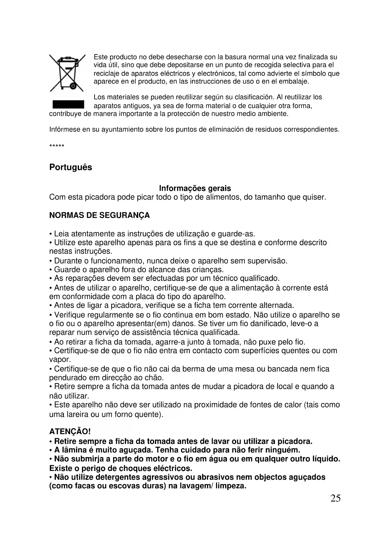 - Retire sempre a ficha da tomada antes de lavar ou utilizar a picadora.