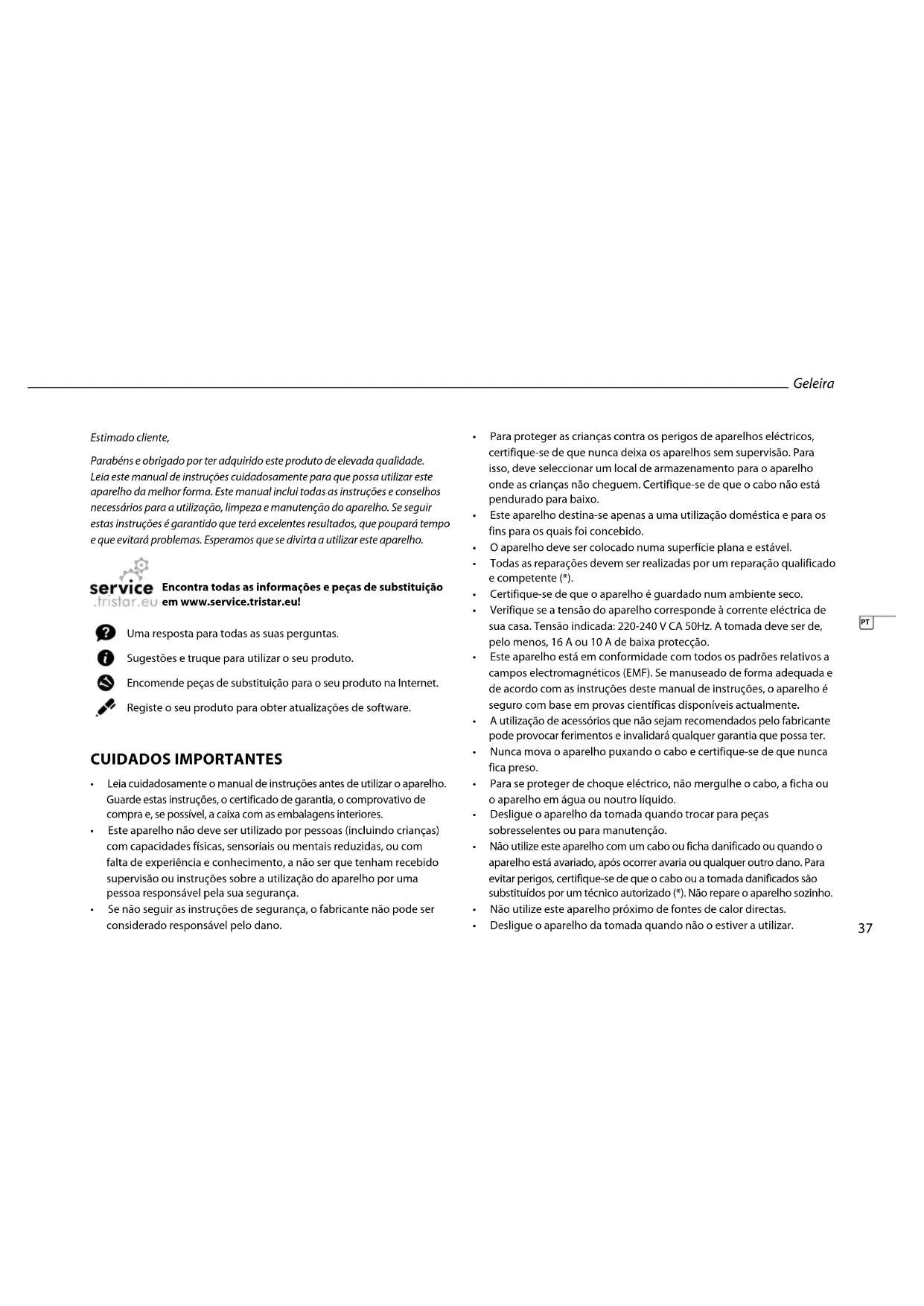 Estimado cliente, Parabéns e obrigado por ter adquirido este produto de elevada qualidade. Leia este manual de instruções cuidadosamente para que possa utilizar este aparelho da melhor forma. Este manual inclui todas as instruções e conselhos necessários para a utilização, limpeza e manutenção do aparelho. Se seguir estas instruções é garantido que terá excelentes resultados, que poupará tempo e que evitará problemas. Esperamos que se divirta a utilizar este aparelho. Encontra todas as informações e peças de substituição em www.service.tristar.eu! Uma resposta para todas as suas perguntas. Sugestões e truque para utilizar o seu produto. Encomende peças de substituição para o seu produto na Internet. Registe o seu produto para obter atualizações de software. CUIDADOS IMPORTANTES