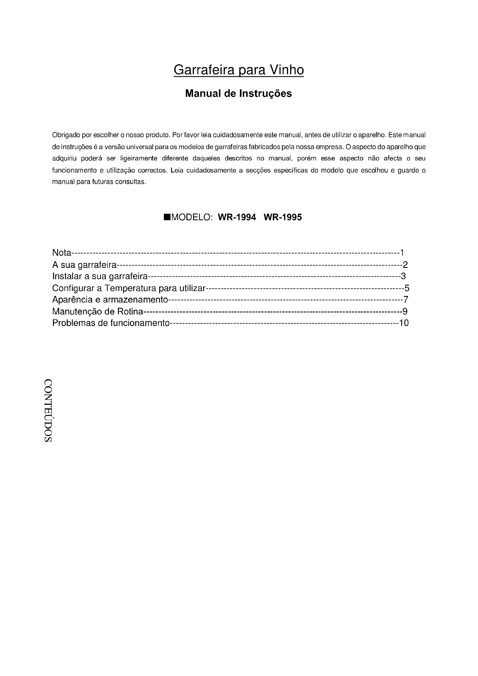 Obrigado por escolher o nosso produto. Por favor leia cuidadosamente este manual, antes de utilizar o aparelho. Este manual de instruções é a versão universal para os modelos de garrafeiras fabricados pela nossa empresa. O aspecto do aparelho que adquiriu poderá ser ligeiramente diferente daqueles descritos no manual, porém esse aspecto não afecta o seu funcionamento e utilização correctos. Leia cuidadosamente a secções específicas do modelo que escolheu e guarde o manual para futuras consultas.