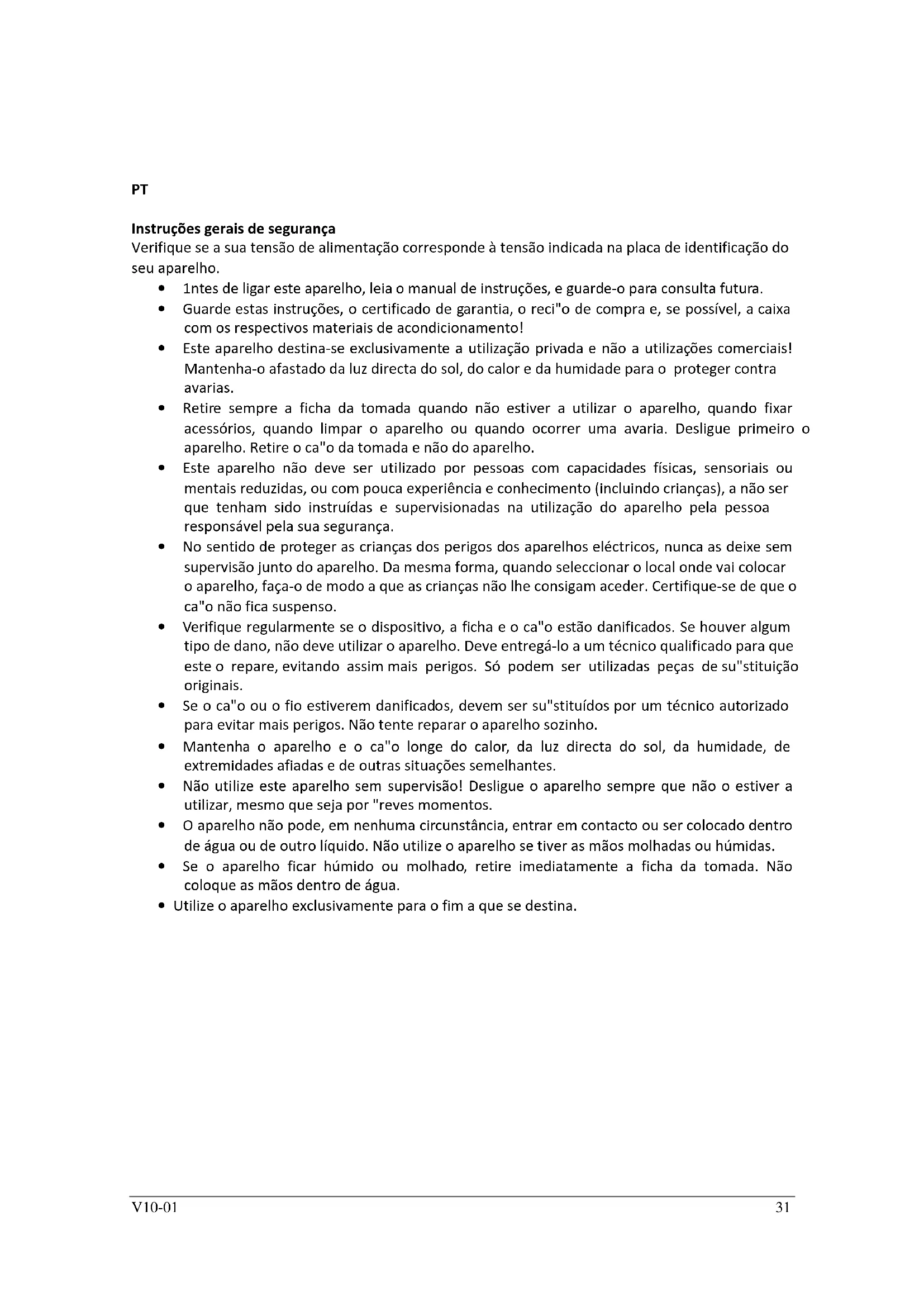 - Utilize o aparelho exclusivamente para o fim a que se destina.V10-01 32 Precauções Leia atentamente este manual de instruções antes de utilizar o produto. Siga as instruções de assistência para o seu funcionamento em segurança e vida mais prolongada. As informações incluídas neste manual de instruções são só para referência, e os dados fornecidos só se adequam para o valor nominal. Para evitar ferimentos, preste atenção às seguintes precauções de segurança: Certifique-se de que a alimentação eléctrica corresponde à tensão indicada na etiqueta antes de ligar o aparelho. O aparelho deve ser ligado a uma tomada eléctrica que tenha ligação terra. O aparelho e os cabos não devem ser deixados em contacto com superfícies extremamente quentes ou fogo.É perigoso desprender os cabos entrançados. Certifique-se de que não existem materiais inflamáveis perto ou em cima do aparelho. Coloque o aparelho deixando pelo menos um espaço de 30 cm entre as paredes. As crianças não devem tocar no aparelho. Tenha cuidado quando puser o aparelho em funcionamento se estiverem crianças por perto! Evite o contacto entre a grelha e o elemento de aquecimento, caso contrário pode causar danos. Proteja o termóstato, o cabo e a ficha do aparelho da chuva. Não utilize o aparelho se o projector de alumínio não estiver mergulhado em água. Desligue o aparelho após utilização, limpeza ou reparação. O cabo de alimentação deverá ser inspeccionado regularmente por sinais de danos e o aparelho não deverá ser utilizado se o cabo estiver danificado. Não utilize o aparelho eléctrico danificado ou aparelhos com ligações danificadas. Para evitar acidentes, chame um técnico especializado para reparar o aparelho. AVISO: o carvão ou combustíveis semelhantes não devem ser utilizados com este aparelho. O aparelho deve ser alimentado através de um dispositivo de protecção diferencial residual (RCD) que tenha um funcionamento residual nominal. Peça informações ao técnico de instalação. Tenha cuidado quando utilizar o aparelho. Entregue o manual de instruções juntamente com o aparelho quando este for passado a qualquer outro utilizador. A temperatura de todas as superfícies de trabalho pode ser extremamente alta quando utilizar este aparelho. Se o cabo de alimentação estiver danificado, deve ser substituído pelo fabricante, pelo seu representante de reparações ou por um técnico igualmente especializado para evitar qualquer acidente. Instruções de segurança adicionais Lembre-se de encaixar a caixa termostática na base. O aparelho não pode ser utilizado sem a caixa termostática encaixada correctamente. A caixa termostática vem equipada com um botão de segurança. O elemento de aquecimento desliga automaticamente quando a caixa termostática for retirada da unidade. Não toque na superfície do elemento de aquecimento a qual tem uma temperatura extremamente alta quando está a ser utilizado.V10-01 33