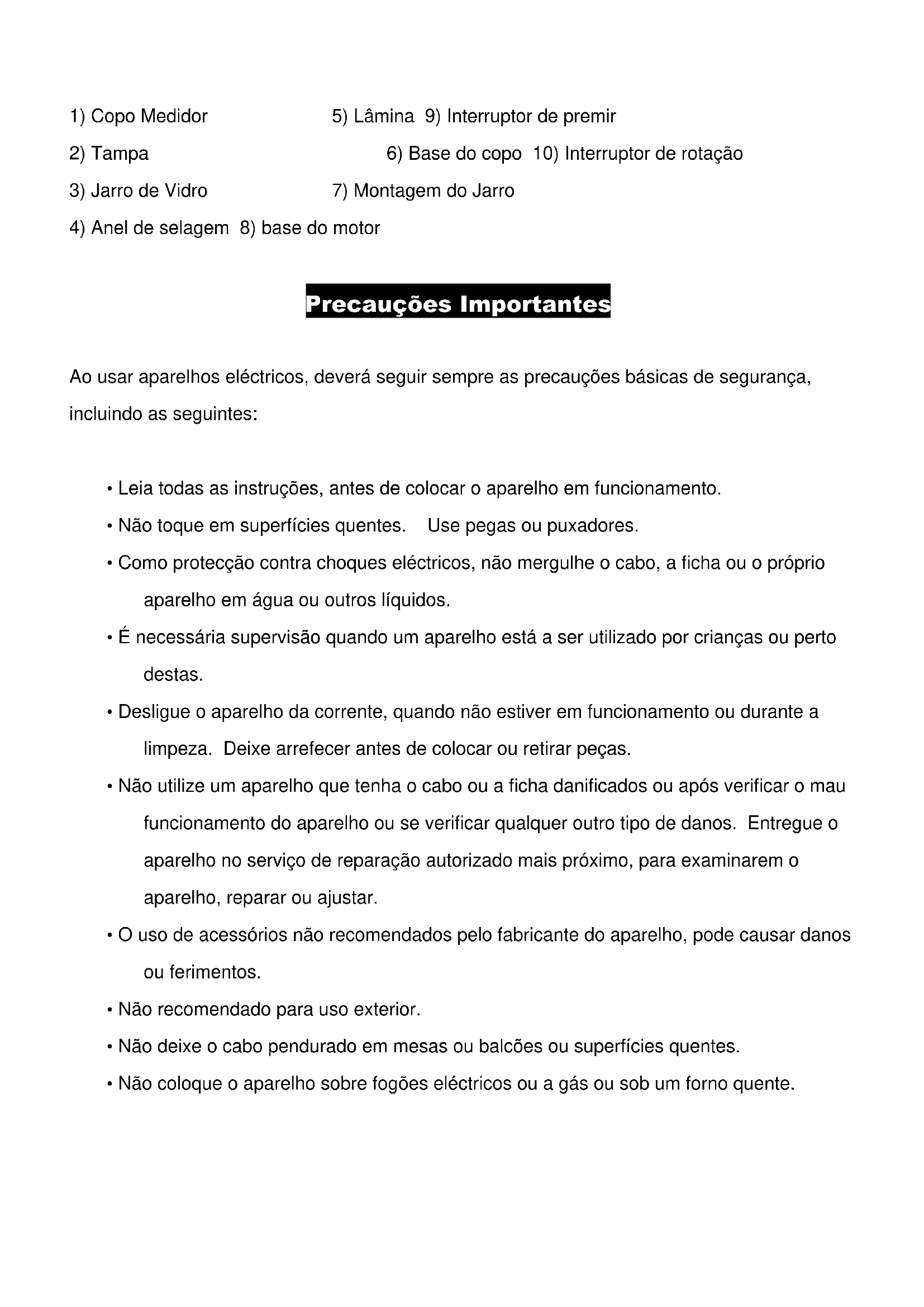 Manual de Instruções Peças & Conteúdos1) Copo Medidor 5) Lâmina 9) Interruptor de premir