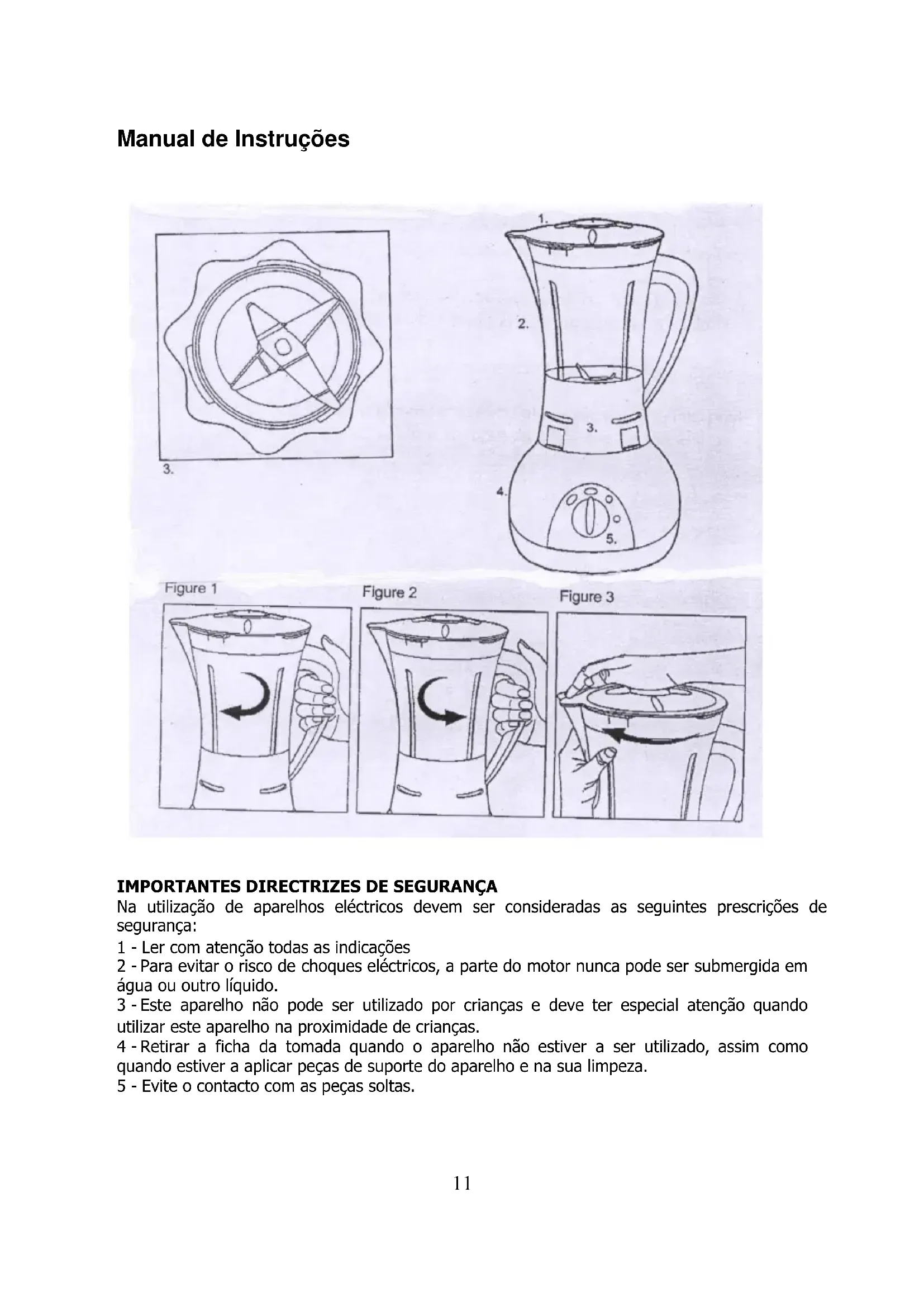 Antes de utilizar a máquina pela primeira vez deve lavar todas as peças soltas em água quente com um pouco de detergente. Colocar o aparelho numa superfície estável e lisa Colocar todas as partes sobre a base. Cuidado: as lâminas são afiadas! Nunca ligar a máquina antes de ter a certeza que todas as peças estejam bem e firmemente colocadas. Nunca ligar o aparelho sem ingredientes. Nunca deixar trabalhar a máquina em vazio porque o motor da máquina pode queimar. Este aparelho foi concebido para uma utilização intermitente. Poderá utiliza-lo de forma continua durante um período máximo de poucos minutos, após o que deve deixar esfriar o motor INSTRUÇÕES PARA A MISTURAR DE INGREDIENTES QUENTES13 Para evitar queimaduras durante a mistura de ingredientes quentes (nunca acima de 80ºC) deverá seguir com atenção as seguintes regras de segurança: Lavar os ingredientes e cortá-los em pequenos pedaços para que possam ser colocados na abertura da tampa. Nunca sobrecarregar o copo. Rodar o interruptor para a posição “2” e deixar misturar alguns minutos. A posição “P” permite controlar com precisão o funcionamento: o motor funcionara a grande velocidade. Rodar para a posição “o” para parar. Os resultados serão sensivelmente melhores se prolongar a mistura. Poderá ser necessário interromper de tempos a tempos a mistura para retirar partículas que colem ao copo. Utilizar para esse efeito uma espátula que permitirá manter a distância de segurança das lâminas. Se necessário juntar um pouco de liquido se o motor se tornar pesado, ou reduzir o conteúdo no copo. LIMPEZA