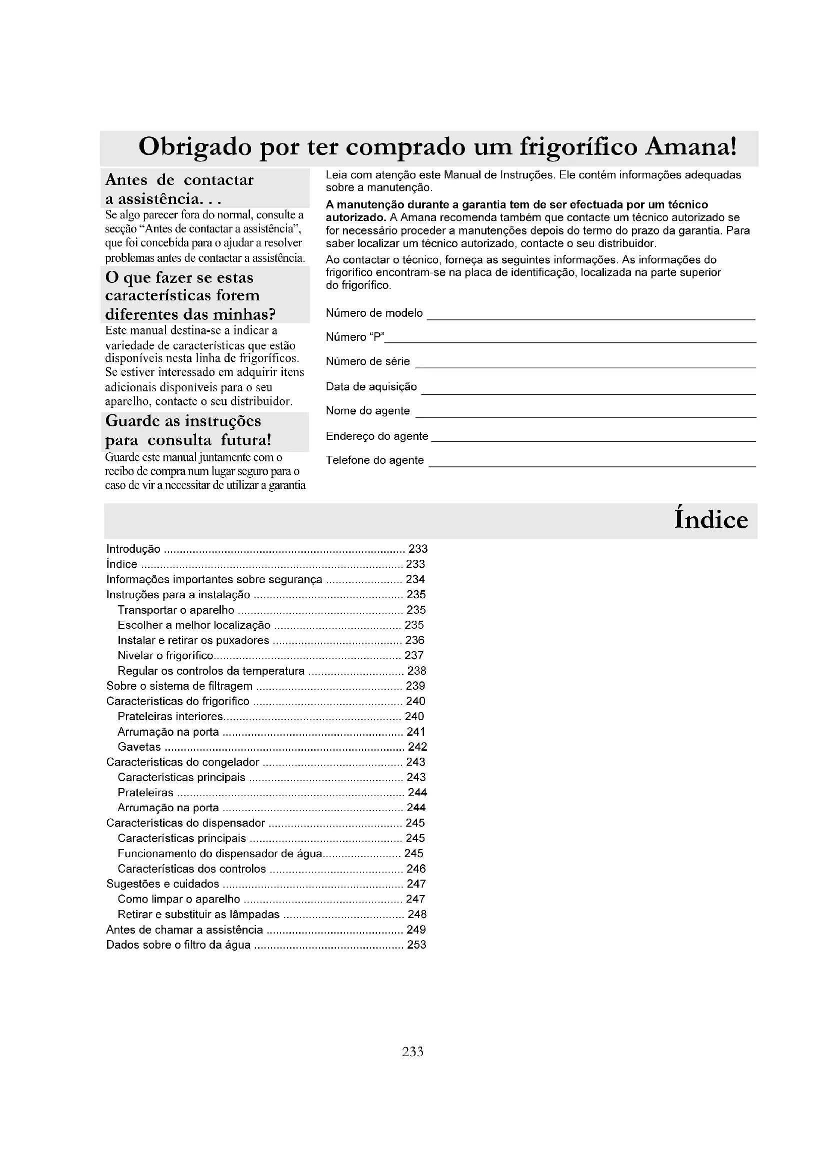 - åéóüäïõLeia com atenção este Manual de Instruções. Ele contém informações adequadas sobre a manutenção. A manutenção durante a garantia tem de ser efectuada por um técnico autorizado. A Amana recomenda também que contacte um técnico autorizado se for necessário proceder a manutenções depois do termo do prazo da garantia. Para saber localizar um técnico autorizado, contacte o seu distribuidor. Ao contactar o técnico, forneça as seguintes informações. As informações do frigorífico encontram-se na placa de identificação, localizada na parte superior do frigorífico. Número de modelo Número P Número de série Data de aquisição Nome do agente Endereço do agente Telefone do agente Obrigado por ter comprado um frigorífico Amana! Introdução p. 233