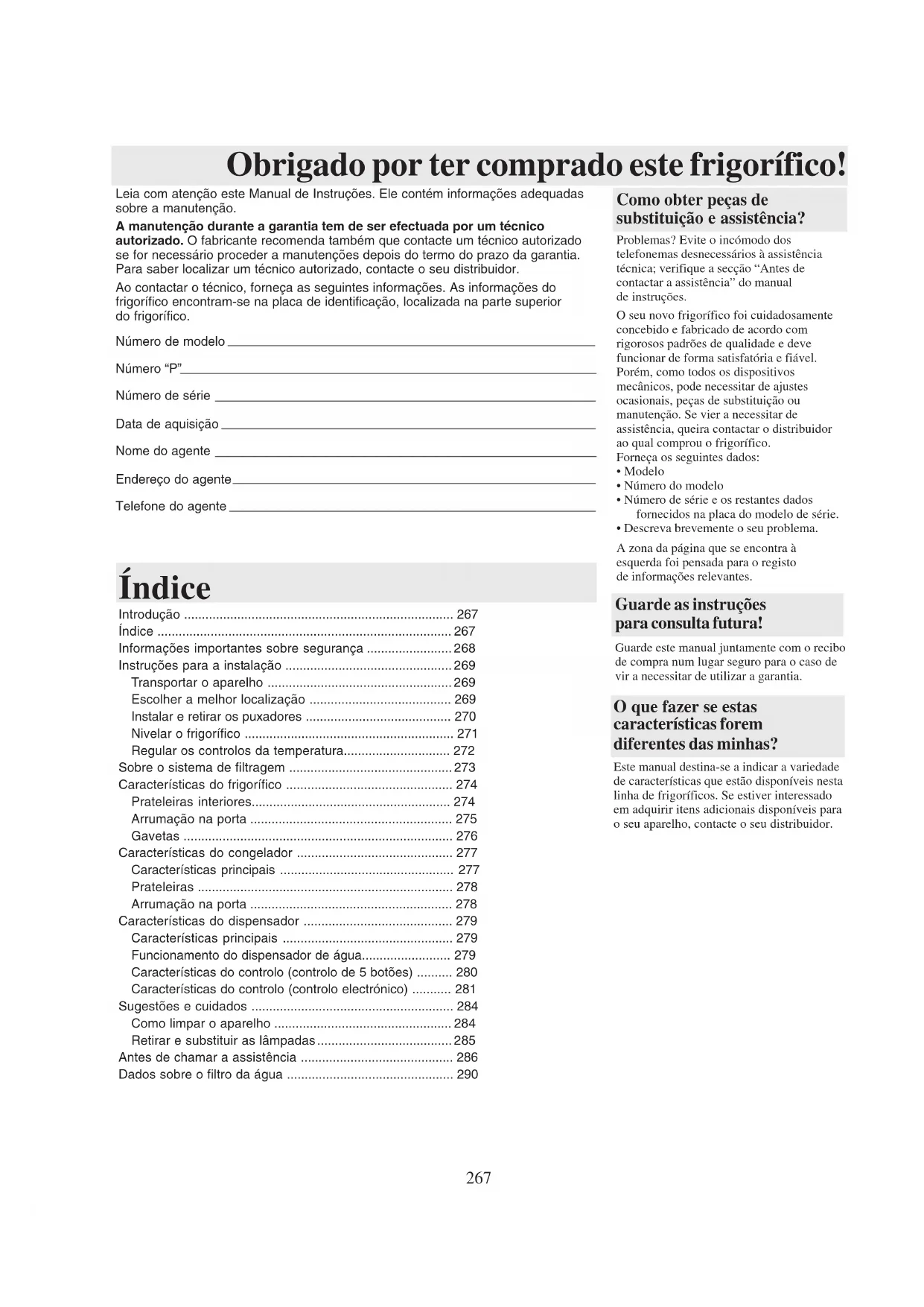 - Descreva brevemente o seu problema. A zona da página que se encontra à esquerda foi pensada para o registo de informações relevantes. O que fazer se estas características forem diferentes das minhas? Este manual destina-se a indicar a variedade de características que estão disponíveis nesta linha de frigoríficos. Se estiver interessado em adquirir itens adicionais disponíveis para o seu aparelho, contacte o seu distribuidor. Guarde as instruções para consulta futura! Guarde este manual juntamente com o recibo de compra num lugar seguro para o caso de vir a necessitar de utilizar a garantia.268 Informações importantes sobre segurança Características à primeira vista