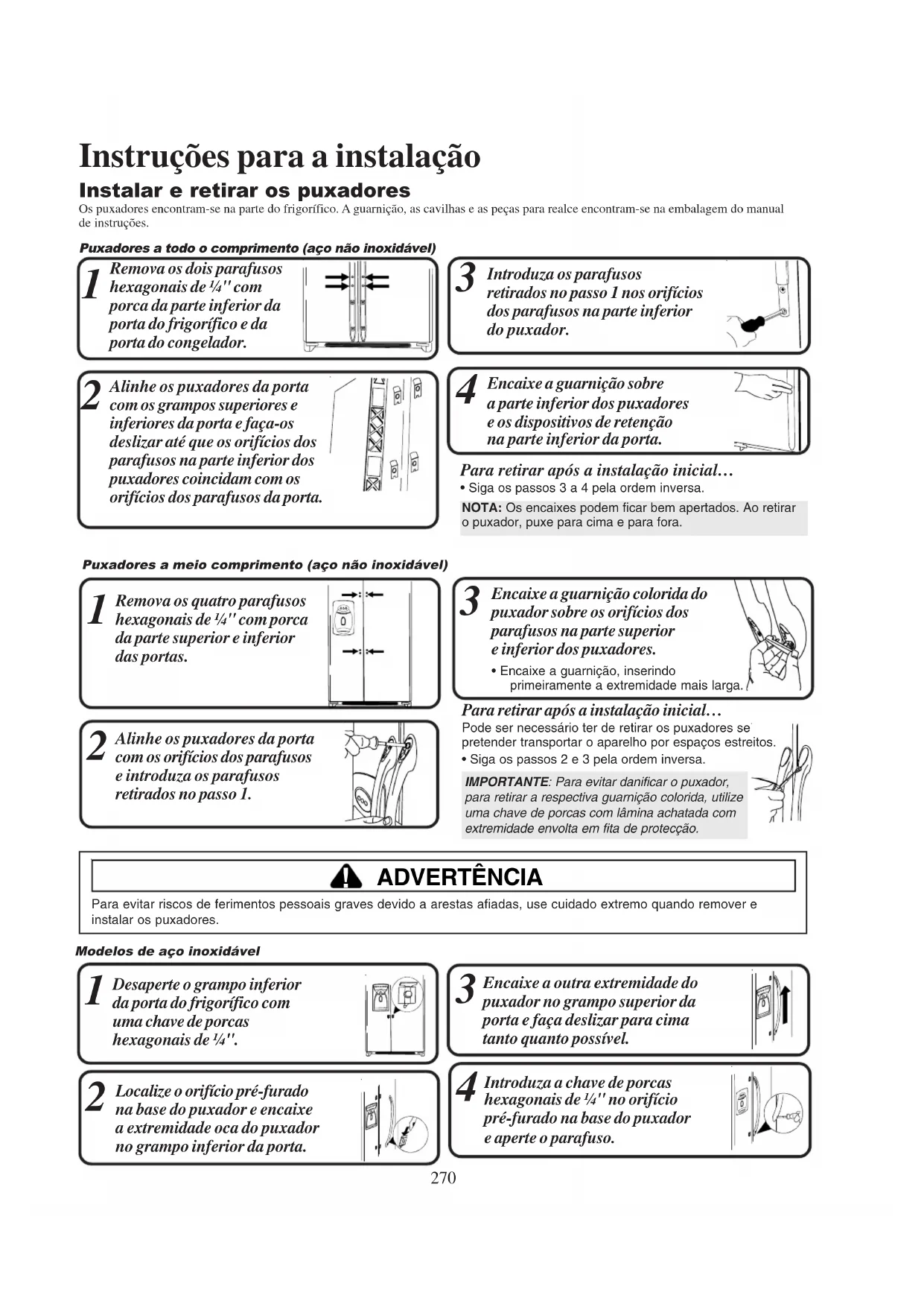 Para evaporar riscos de ferimentos pessoas graves devido a arestas afiadas, use cuidado extremo quando remover e instalar os puxadores.