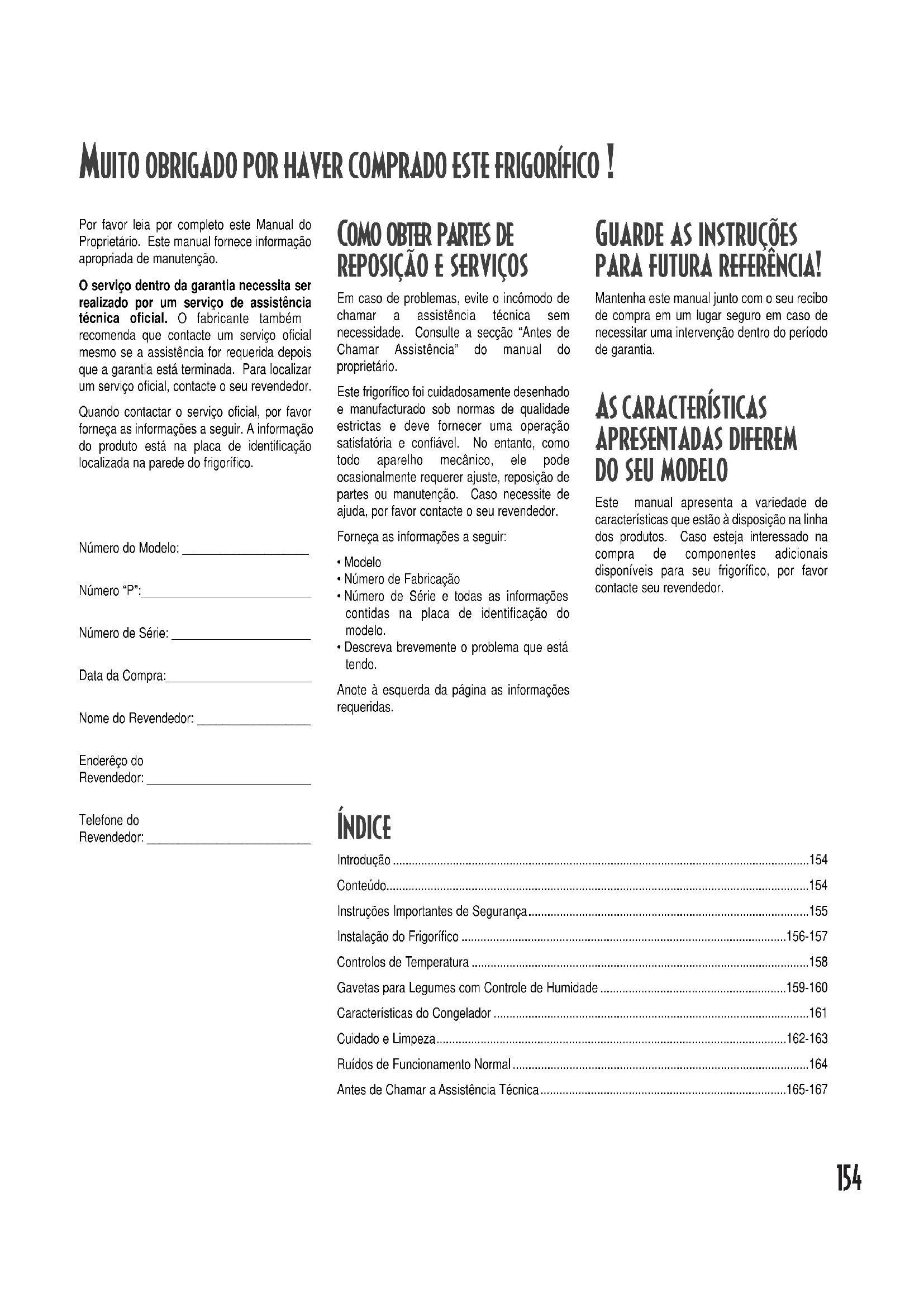 Por favor leia por completo este Manual do Proprietário. Este manual fornece informação apropriada de manutenção. O serviço dentro da garantia necessita ser realizado por um serviço de assistência técnica oficial. O fabricante também recomenda que contacte um serviço oficial mesmo se a assistência for requerida depois que a garantia está terminada. Para localizar um serviço oficial, contacte o seu revendedor. Quando contactar o serviço oficial, por favor forneça as informações a seguir. A informação do produto está na placa de identificação localizada na parede do frigorífico. Número do Modelo: ____________________ Número “P”:___________________________ Número de Série: ______________________ Data da Compra:_______________________ Nome do Revendedor: __________________ Enderêço do Revendedor: __________________________ Telefone do Revendedor: __________________________ Como obter partes de reposição e serviços Em caso de problemas, evite o incômodo de chamar a assistência técnica sem necessidade. Consulte a secção “Antes de Chamar Assistência” do manual do proprietário. Este frigorífico foi cuidadosamente desenhado e manufacturado sob normas de qualidade estrictas e deve fornecer uma operação satisfatória e confiável. No entanto, como todo aparelho mecânico, ele pode ocasionalmente requerer ajuste, reposição de partes ou manutenção. Caso necessite de ajuda, por favor contacte o seu revendedor. Forneça as informações a seguir: