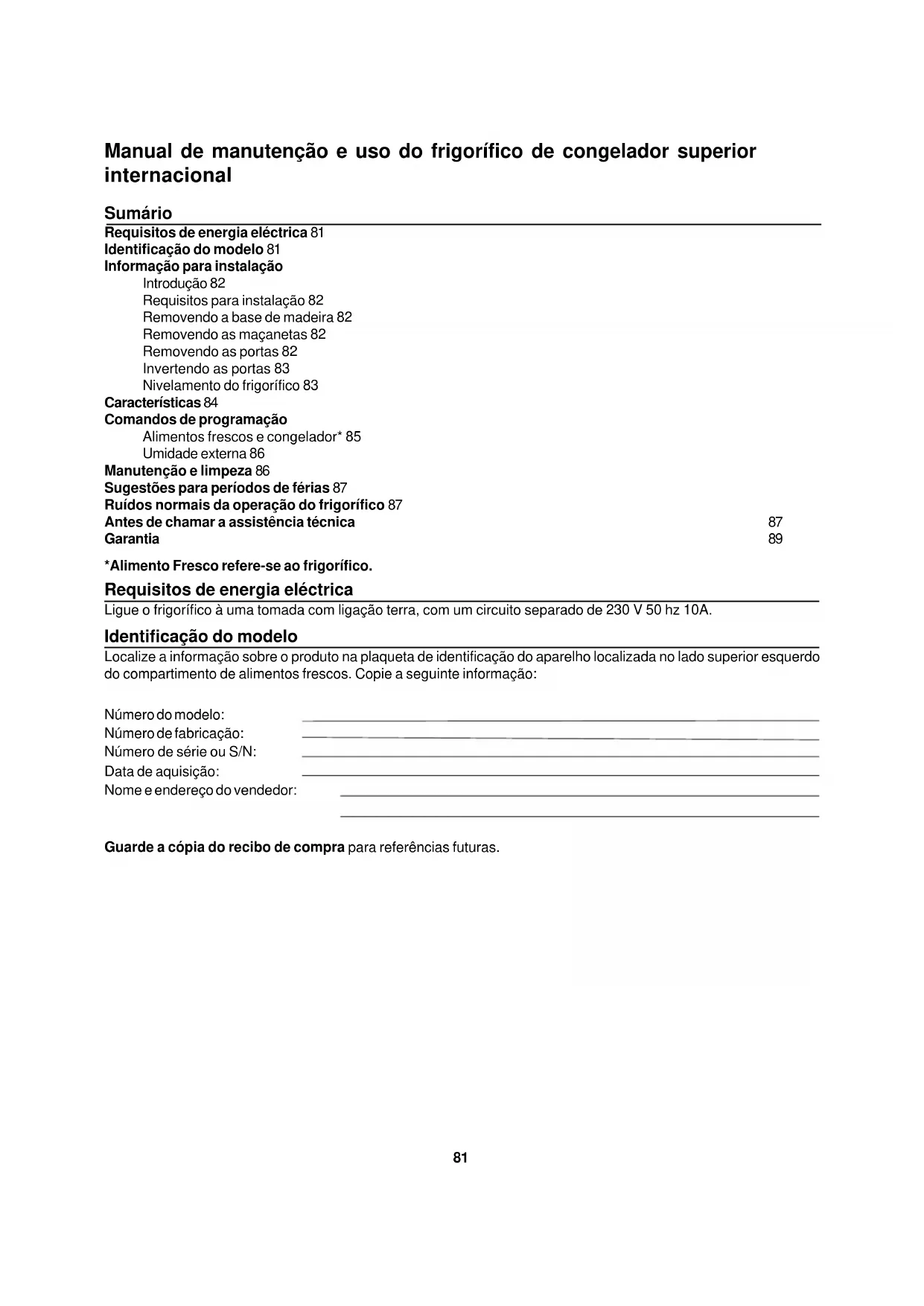 Localize a informacao sobre o produits na plaqueta de identificacao do aparelho localizada no lado superior esquerdo do compartmento de alimentos frescos. Copie a segunte informacao: