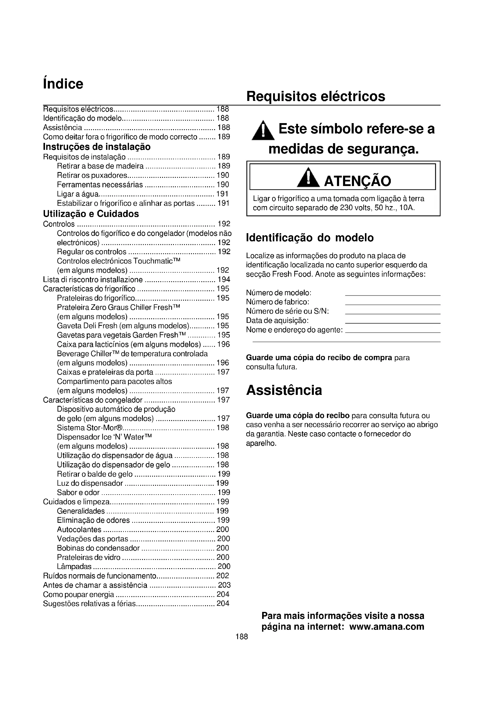 - ðáñï÷Þ íåñïý óôï øõãåßï êáé óçêþóôå ôï âñá÷ßïíá ôçò ìç÷áíÞò ðáãïêýâùí åðÜíù, óôçí êëåéóôÞ èÝóç.188 Requisitos eléctricos Este símbolo refere-se a medidas de segurança. ATENÇÃO Ligar o frigorífico a uma tomada com ligação à terra com circuito separado de 230 volts, 50 hz., 10A. Identificação do modelo Localize as informações do produto na placa de identificação localizada no canto superior esquerdo da secção Fresh Food. Anote as seguintes informações: Número de modelo: Número de fabrico: Número de série ou S/N: Data de aquisição: Nome e endereço do agente: Guarde uma cópia do recibo de compra para consulta futura. Assistência Guarde uma cópia do recibo para consulta futura ou caso venha a ser necessário recorrer ao serviço ao abrigo da garantia. Neste caso contacte o fornecedor do aparelho. Para mais informações visite a nossa página na internet: www.amana.com Índice Requisitos eléctricos p. 188