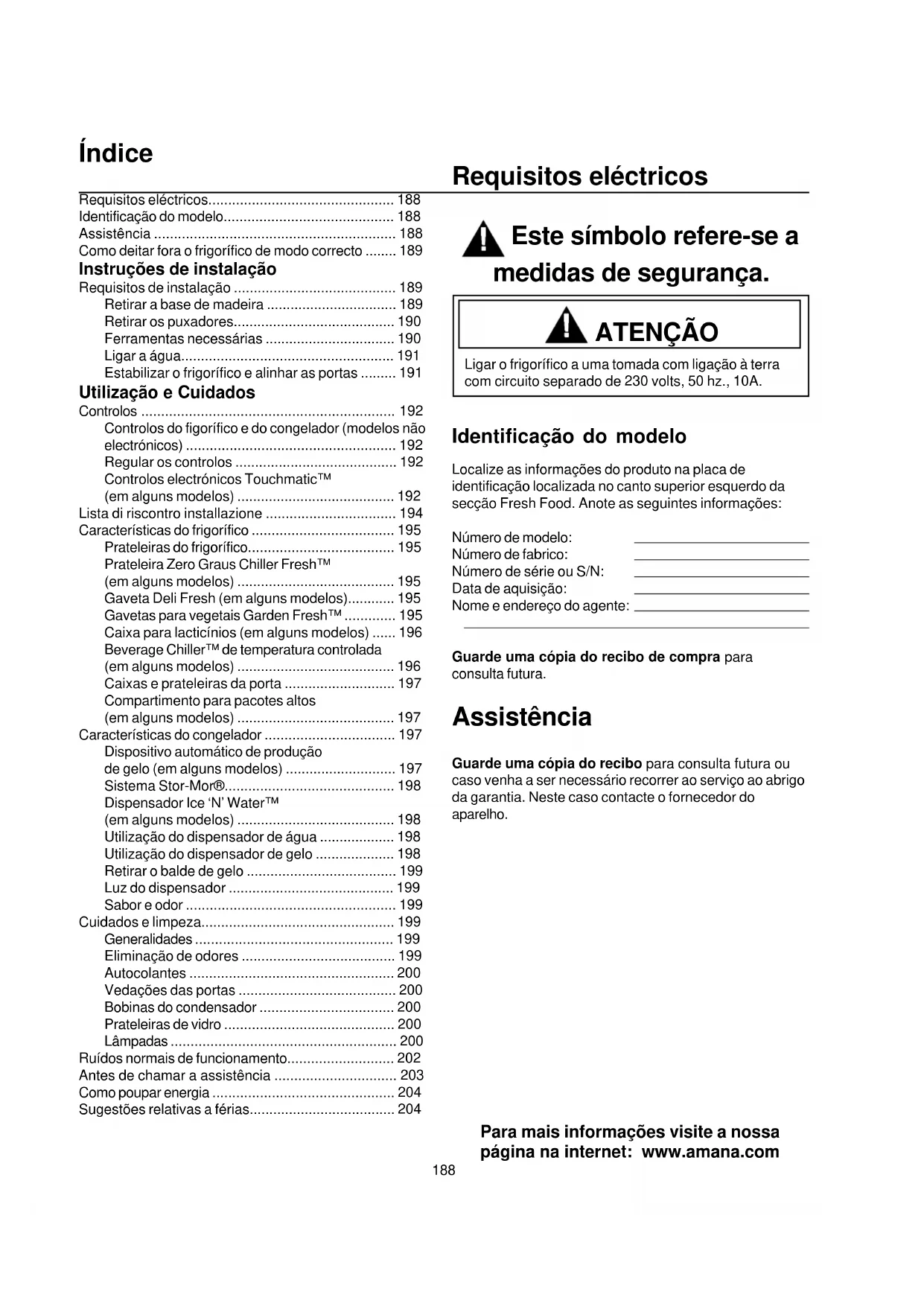 - ðáñï÷Þ íåñïý óôï øõãåßï êáé óçêþóôå ôï âñá÷ßïíá ôçò ìç÷áíÞò ðáãïêýâùí åðÜíù, óôçí êëåéóôÞ èÝóç.188 Requisitos eléctricos Este símbolo refere-se a medidas de segurança. ATENÇÃO Ligar o frigorífico a uma tomada com ligação à terra com circuito separado de 230 volts, 50 hz., 10A. Identificação do modelo Localize as informações do produto na placa de identificação localizada no canto superior esquerdo da secção Fresh Food. Anote as seguintes informações: Número de modelo: Número de fabrico: Número de série ou S/N: Data de aquisição: Nome e endereço do agente: Guarde uma cópia do recibo de compra para consulta futura. Assistência Guarde uma cópia do recibo para consulta futura ou caso venha a ser necessário recorrer ao serviço ao abrigo da garantia. Neste caso contacte o fornecedor do aparelho. Para mais informações visite a nossa página na internet: www.amana.com Índice Requisitos eléctricos p. 188