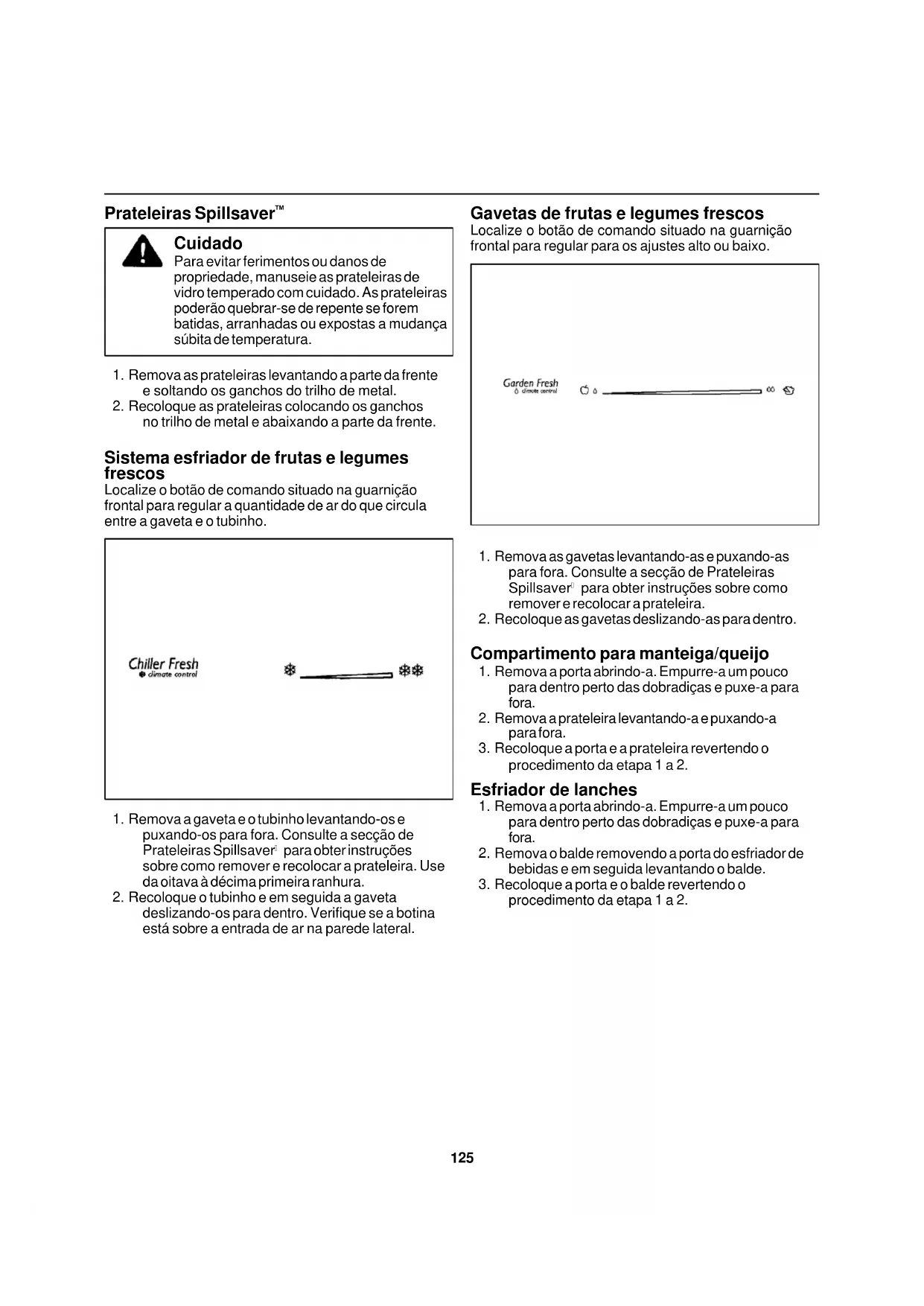 Cuidado Para evitar ferimentos ou danos de propriedade, manuseie as prateleiras de vidro temperado com cuidado. As prateleiras poderão quebrar-se de repente se forem batidas, arranhadas ou expostas a mudança súbita de temperatura.