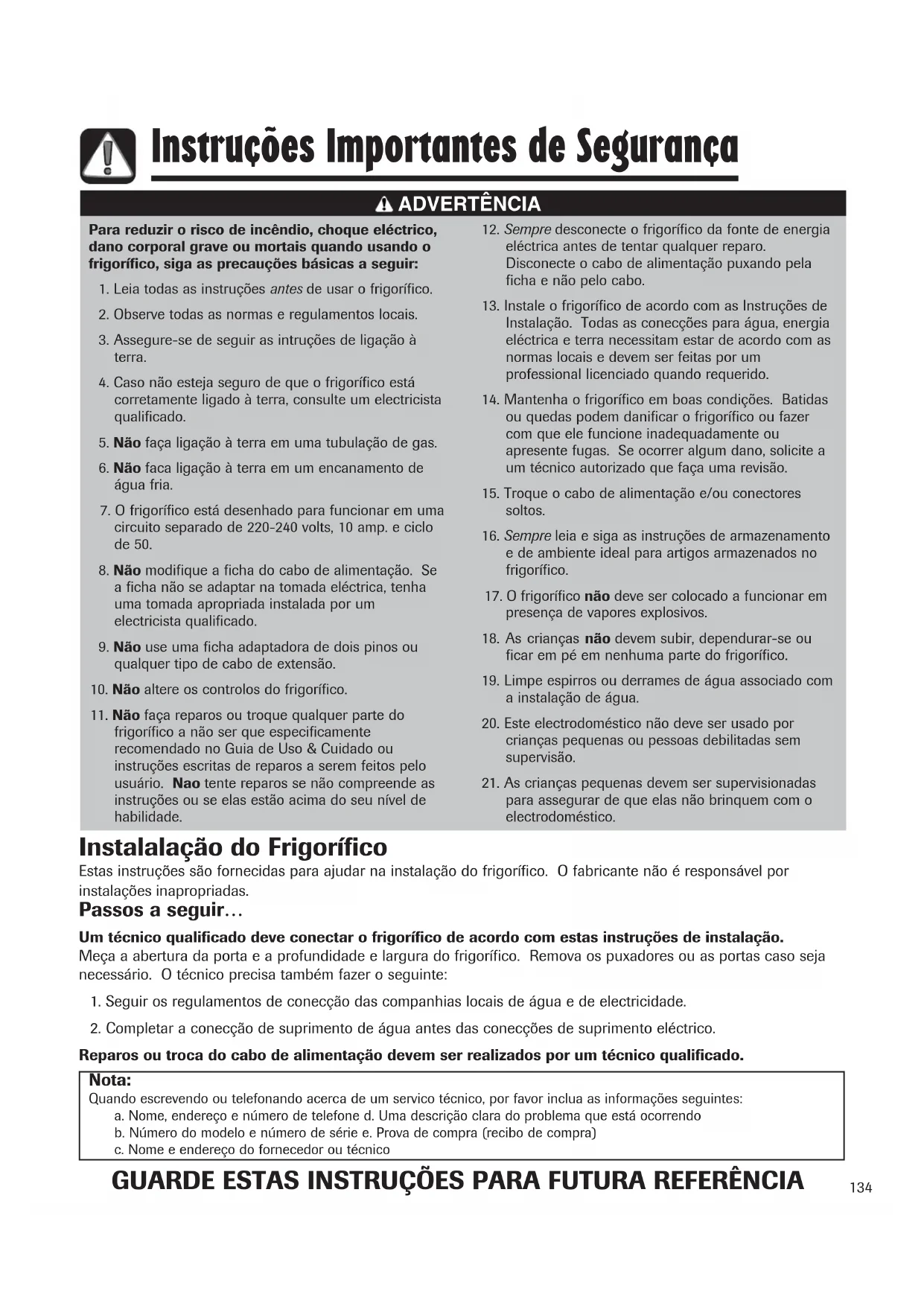 - ∞¡∆πª∂∆ø¶π™∏132 Frigorífico Guia de Uso e Cuidado Instruções Importantes de Segurança p. 133