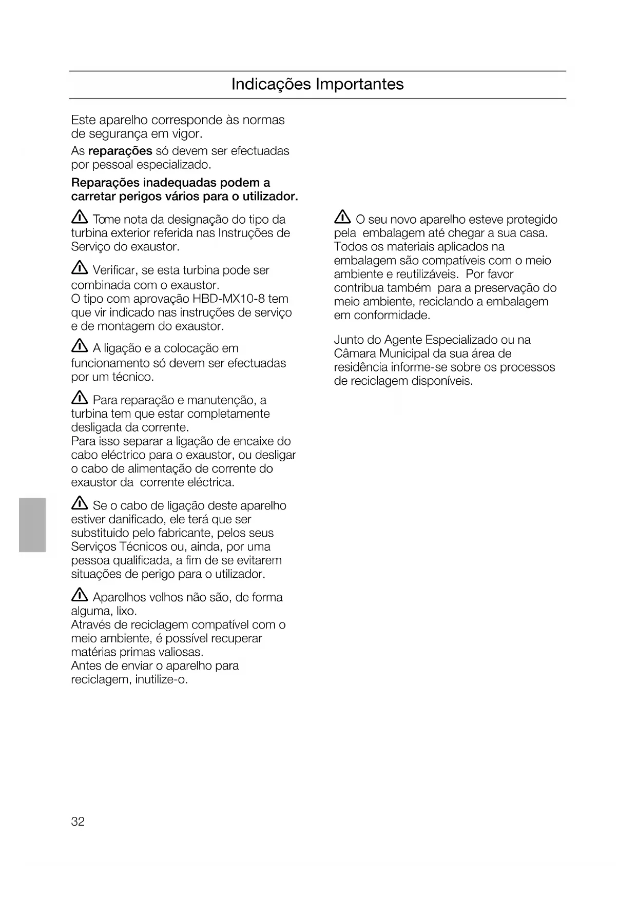 eléctrica con la campana de aspiración. Por razones de seguridad, el recubrimiento adicional del enchufe deberá permanecer siempre montado y cerrado.32 Indicações Importantes Este aparelho corresponde às normas de segurança em vigor. As reparações só devem ser efectuadas por pessoal especializado. Reparações inadequadas podem a carretar perigos vários para o utilizador. Tome nota da designação do tipo da turbina exterior referida nas Instruções de Serviço do exaustor. Verificar, se esta turbina pode ser combinada com o exaustor. O tipo com aprovação HBD-MX10-8 tem que vir indicado nas instruções de serviço e de montagem do exaustor. A ligação e a colocação em funcionamento só devem ser efectuadas por um técnico. Para reparação e manutenção, a turbina tem que estar completamente desligada da corrente. Para isso separar a ligação de encaixe do cabo eléctrico para o exaustor, ou desligar o cabo de alimentação de corrente do exaustor da corrente eléctrica. Se o cabo de ligação deste aparelho estiver danificado, ele terá que ser substituido pelo fabricante, pelos seus Serviços Técnicos ou, ainda, por uma pessoa qualificada, a fim de se evitarem situações de perigo para o utilizador. Aparelhos velhos não são, de forma alguma, lixo. Através de reciclagem compatível com o meio ambiente, é possível recuperar matérias primas valiosas. Antes de enviar o aparelho para reciclagem, inutilize-o. Este aparelho corresponde às normas de segurança em vigor. As reparações só devem ser efectuadas por pessoal especializado. Reparações inadequadas podem a carretar perigos vários para o utilizador. O seu novo aparelho esteve protegido pela embalagem até chegar a sua casa. Todos os materiais aplicados na embalagem são compatíveis com o meio ambiente e reutilizáveis. Por favor contribua também para a preservação do meio ambiente, reciclando a embalagem em conformidade. Junto do Agente Especializado ou na Câmara Municipal da sua área de residência informe-se sobre os processos de reciclagem disponíveis.33 Antes da Montagem